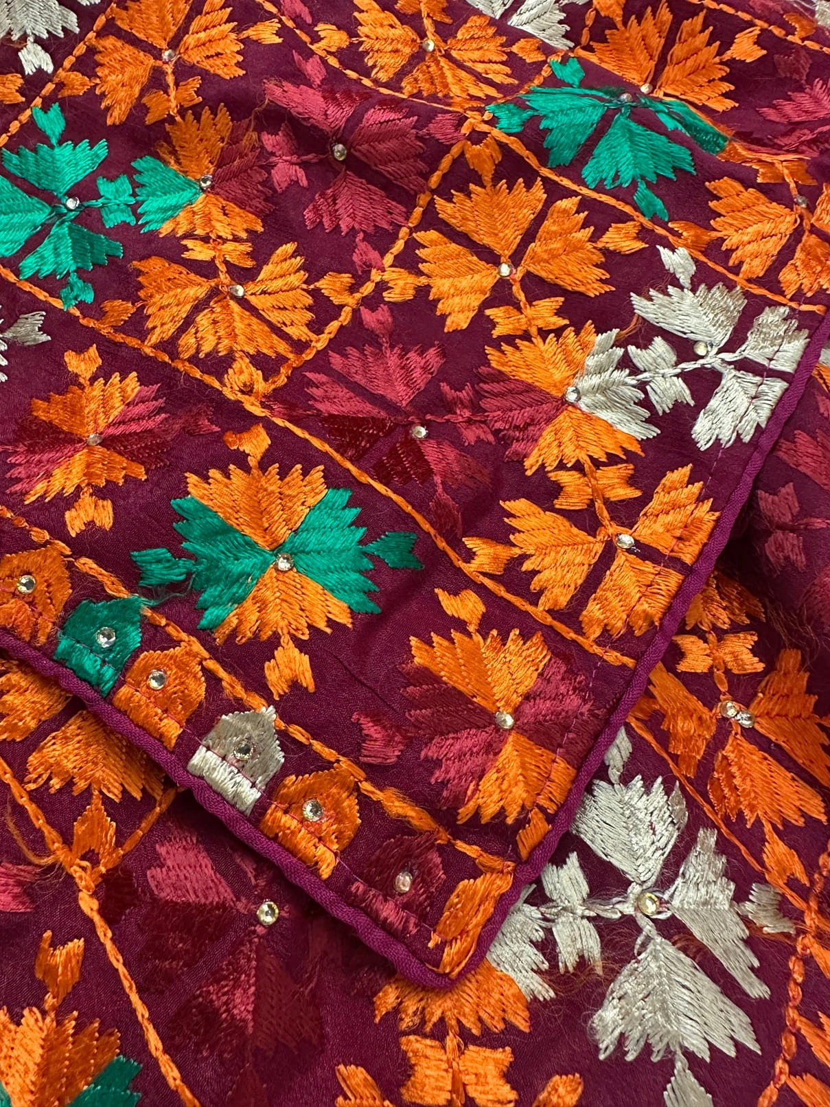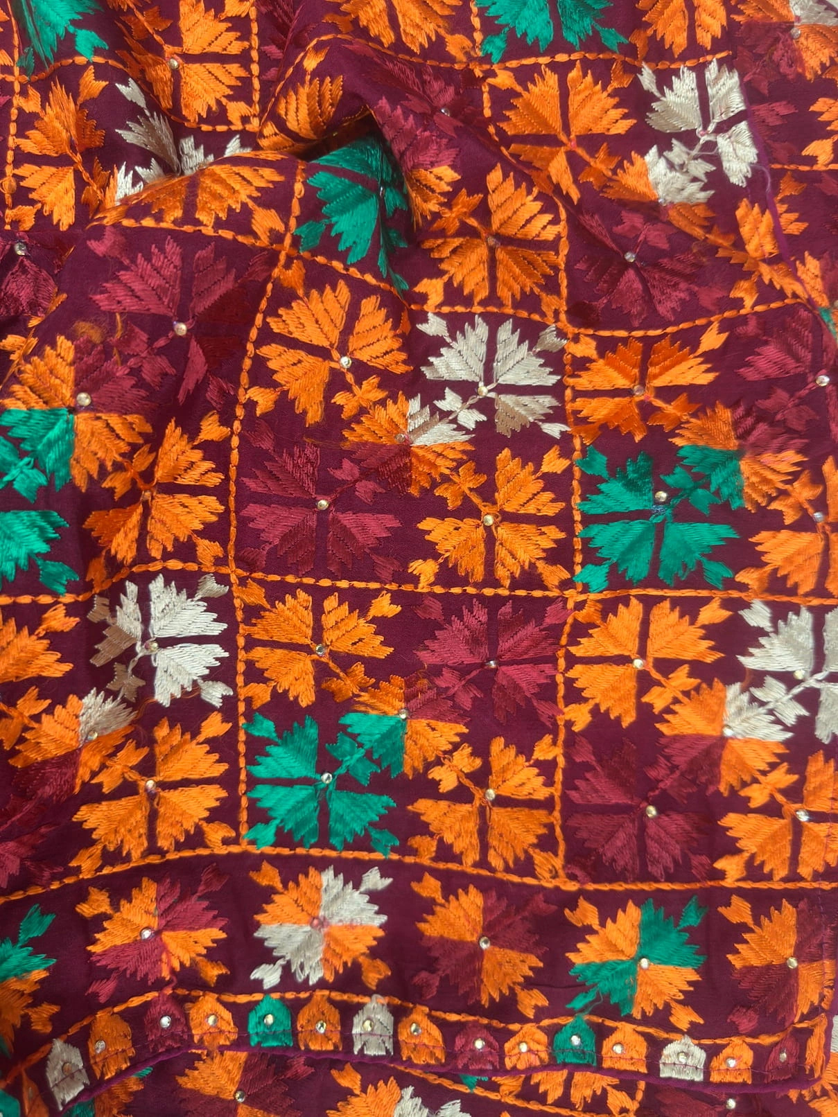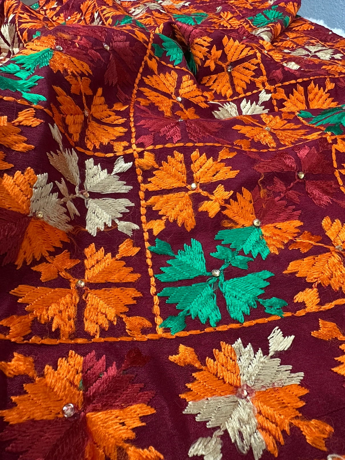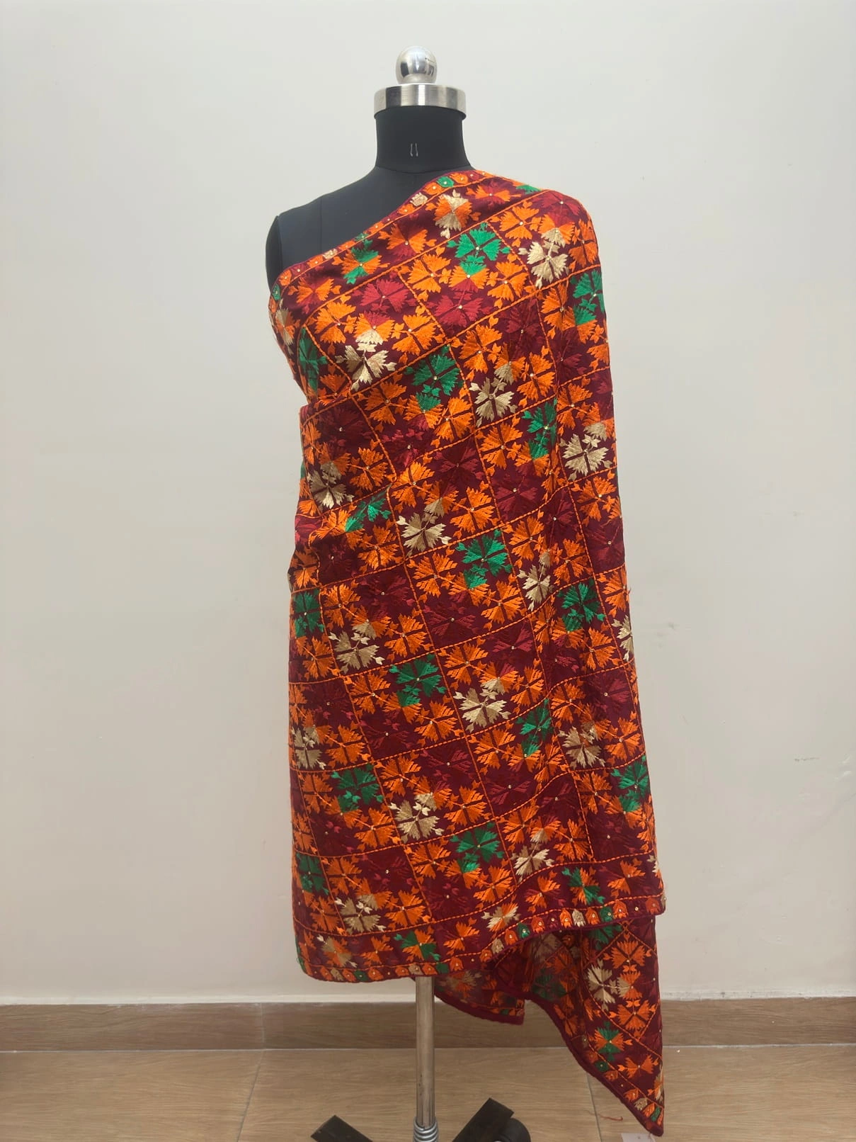 Elevate your ethnic wardrobe with this authentic Phulkari Dupatta crafted from premium Chinnon fabric, Featuring a full baag embroidery style with intricate stone work patterns. this dupatta embodies the rich cultural heritage of Punjab. The vibrant hues of red, orange, green, and gold make it a festive essential, perfect for weddings, parties, and traditional celebrations.