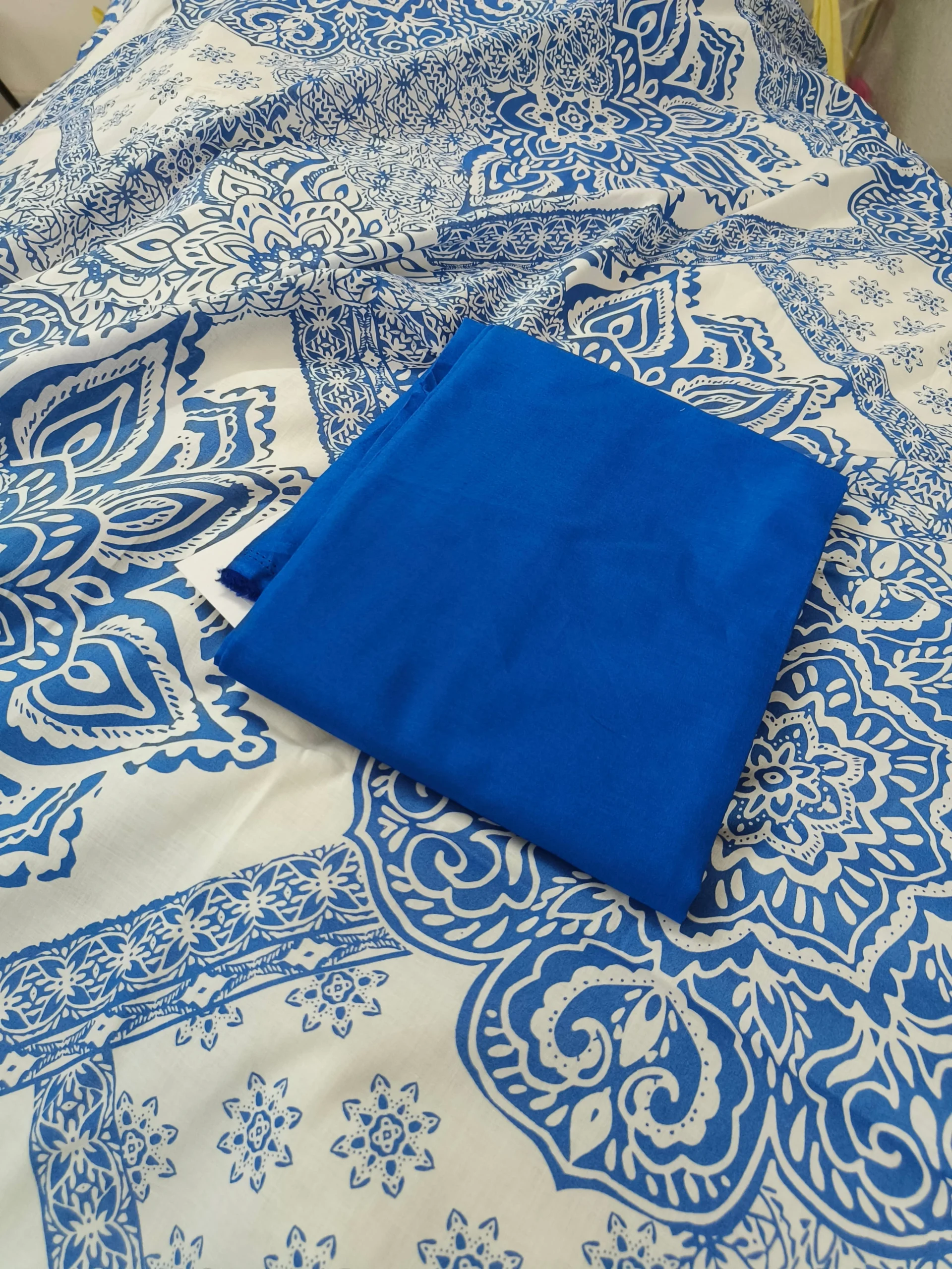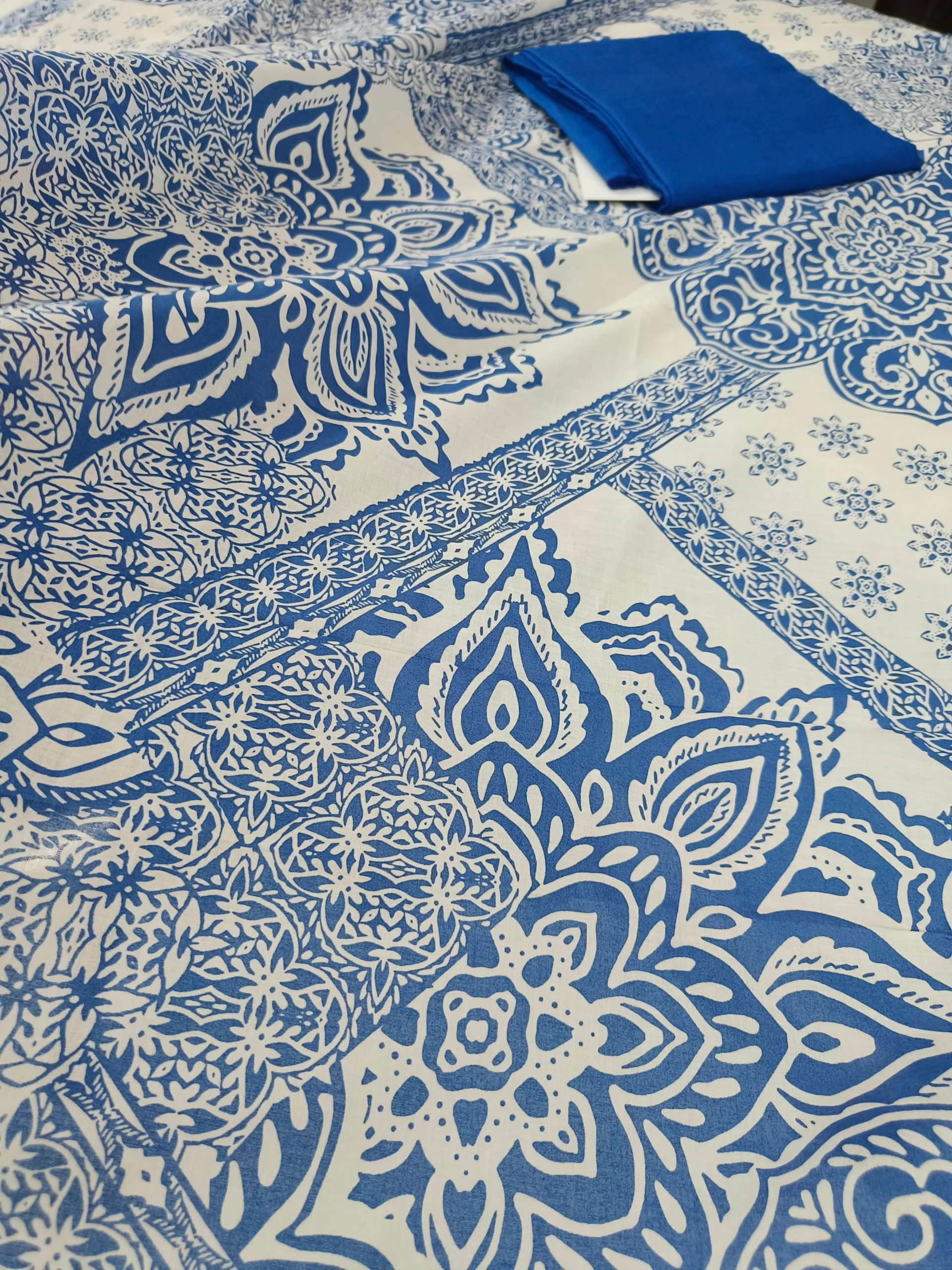 - Color: Top – White with Blue Floral; Bottom – Royal Blue; Dupatta – Coordinated Blue & White