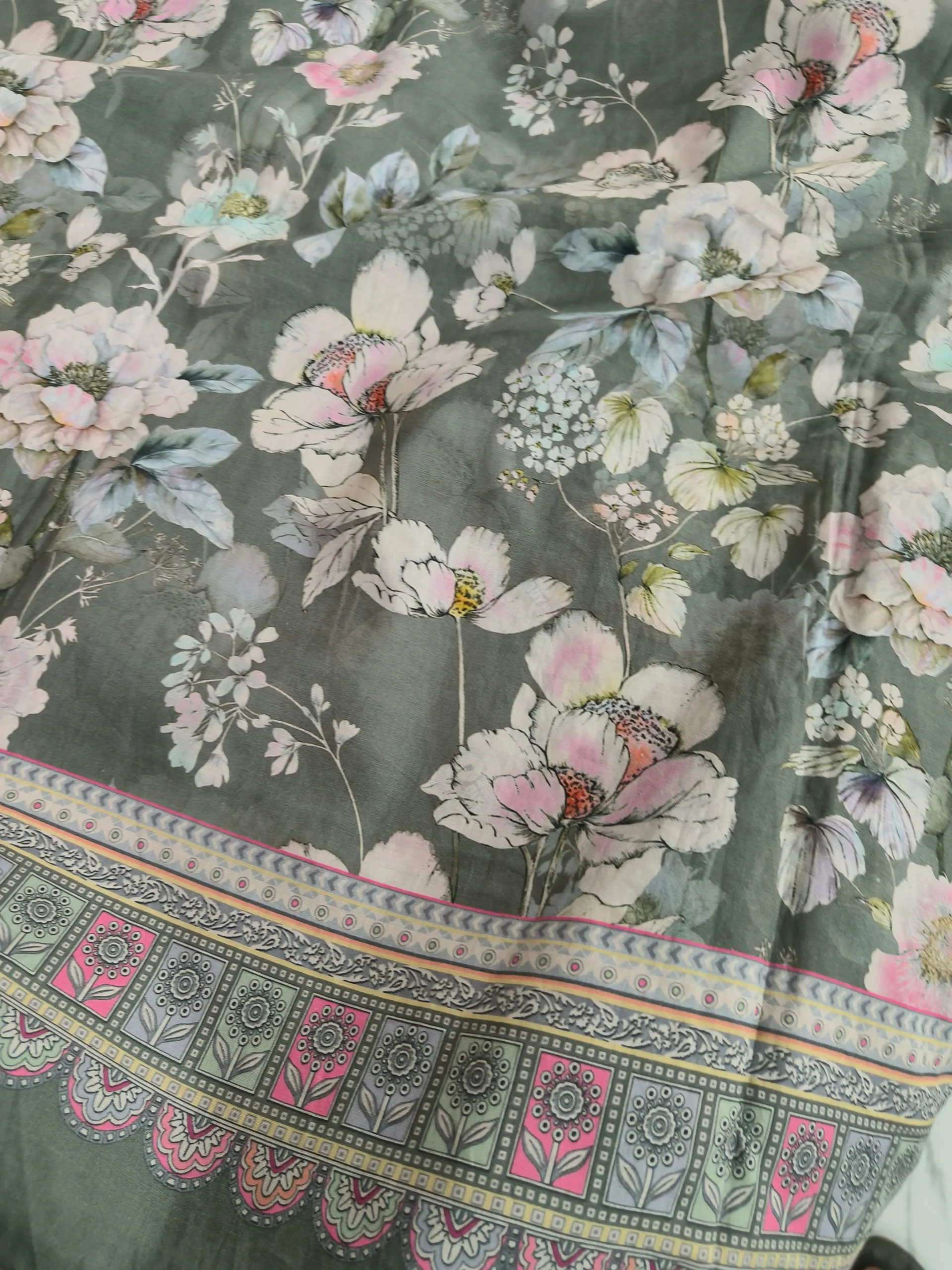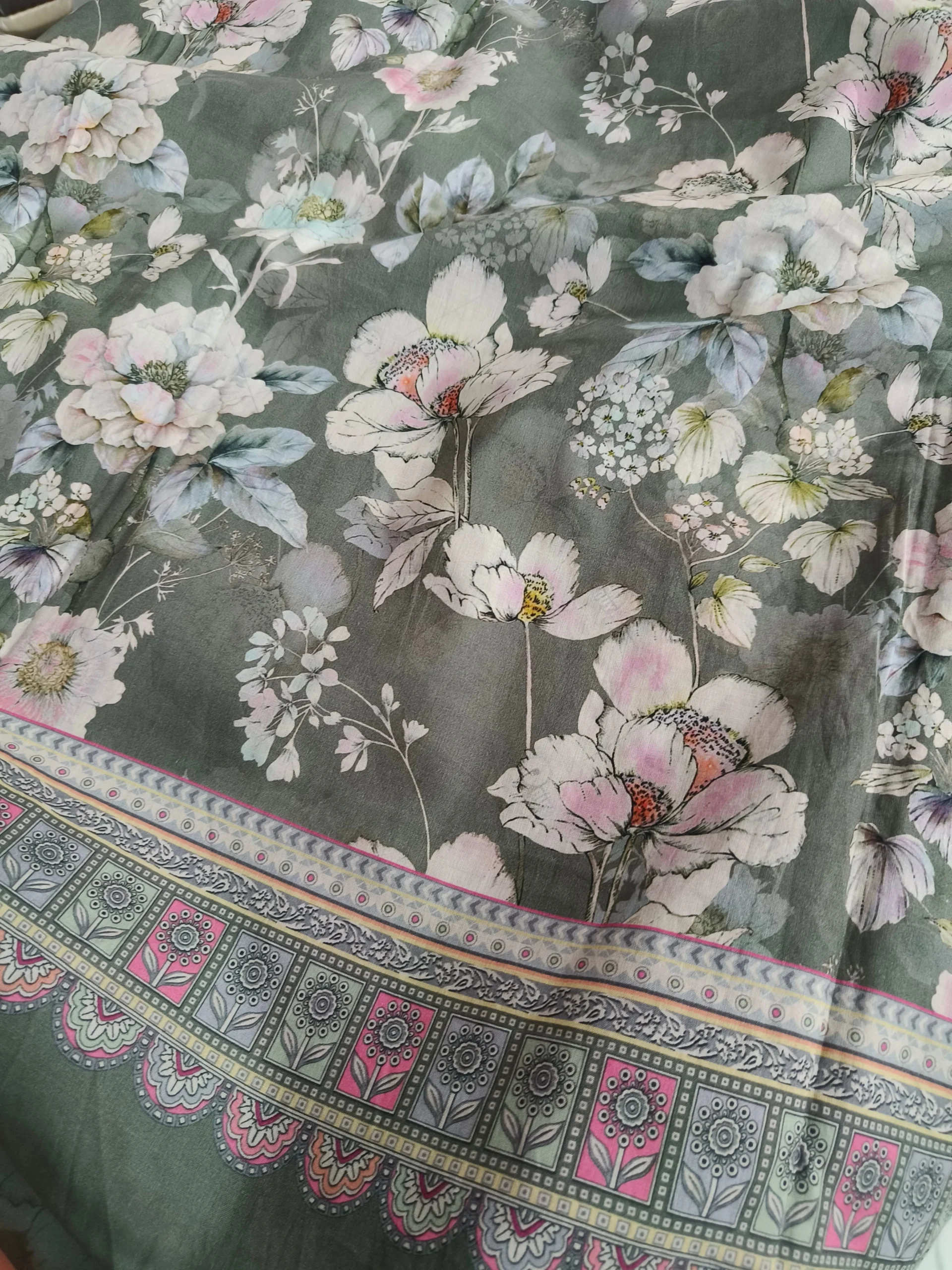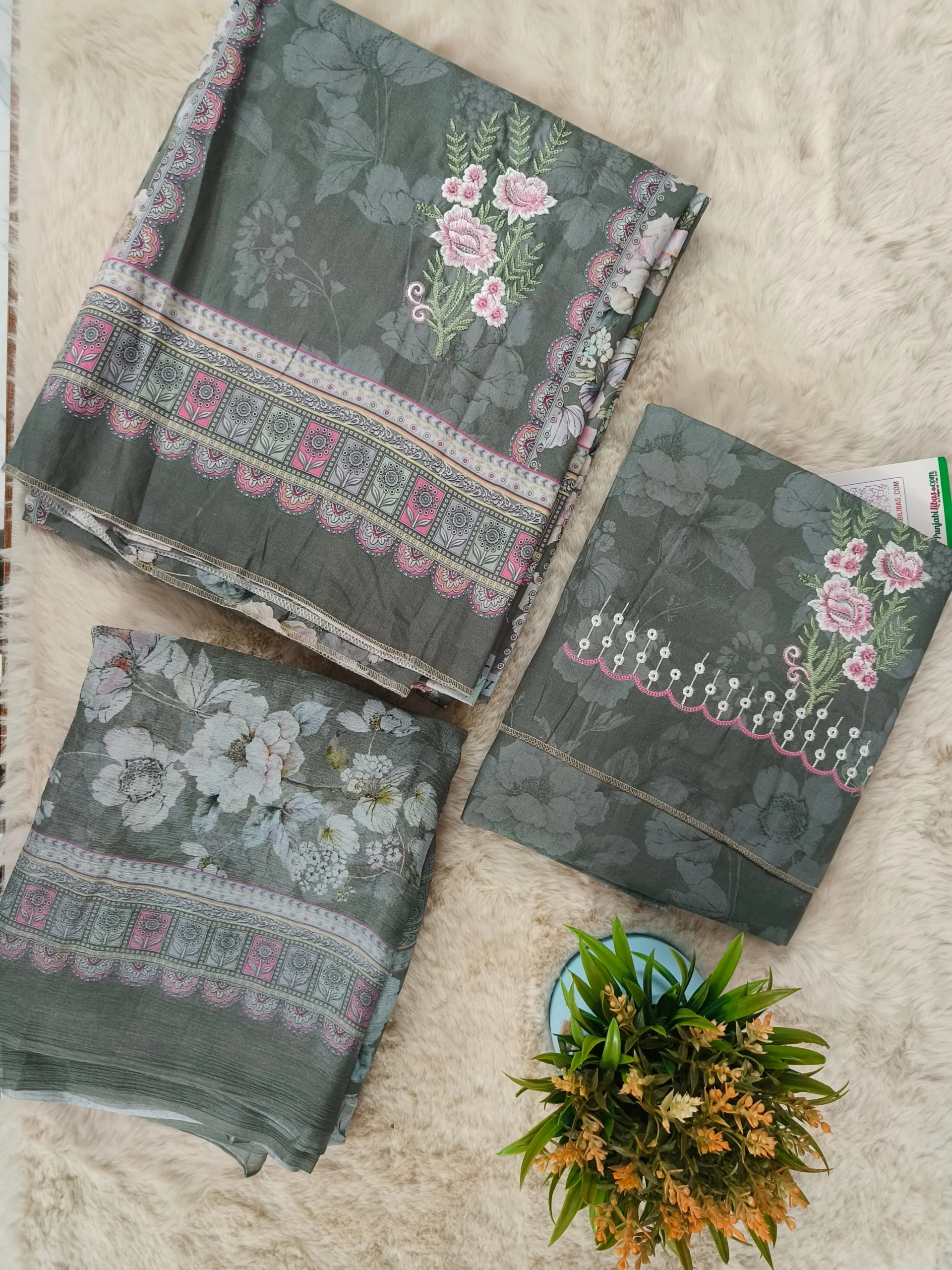 Step into timeless elegance with this Cotton Printed Unstitched Suit Set featuring vibrant pink floral motifs on a rich dark green base. The intricate geometric border patterns in purple and blue add a touch of sophistication, while the lightweight chiffon dupatta completes the ensemble with graceful flow. Perfect for women who value comfort, tradition, and versatile styling, this suit set offers generous fabric lengths for custom tailoring.