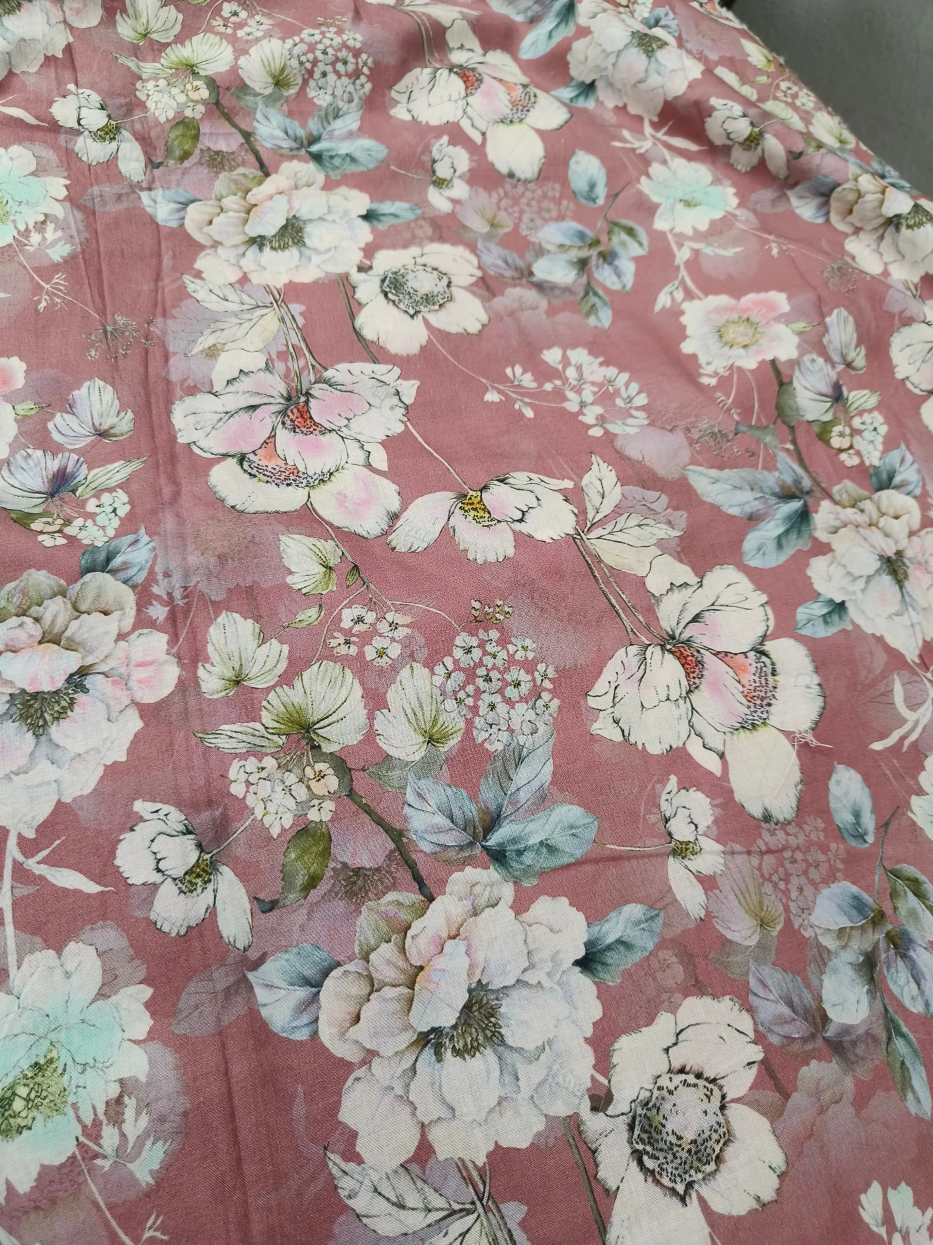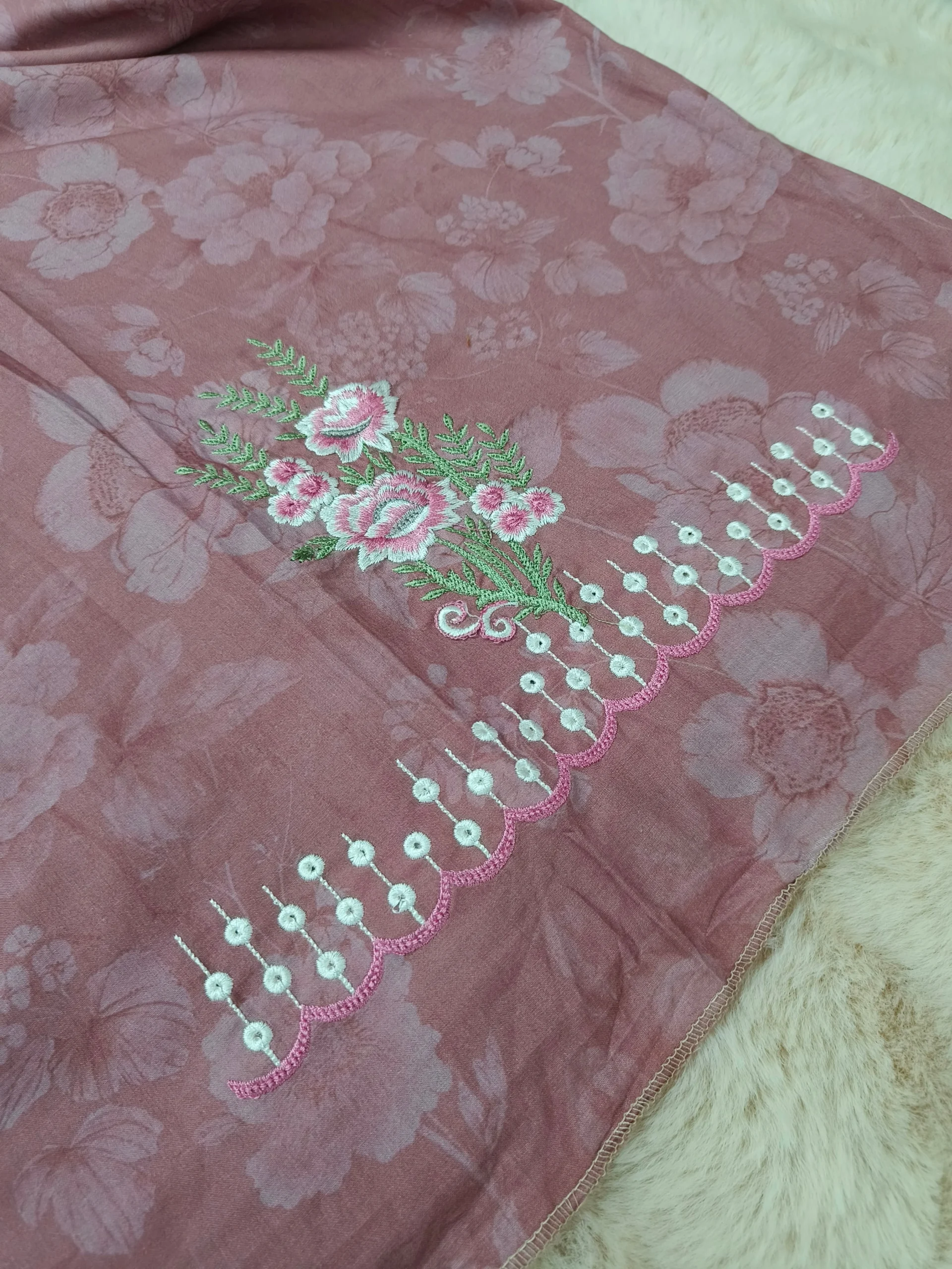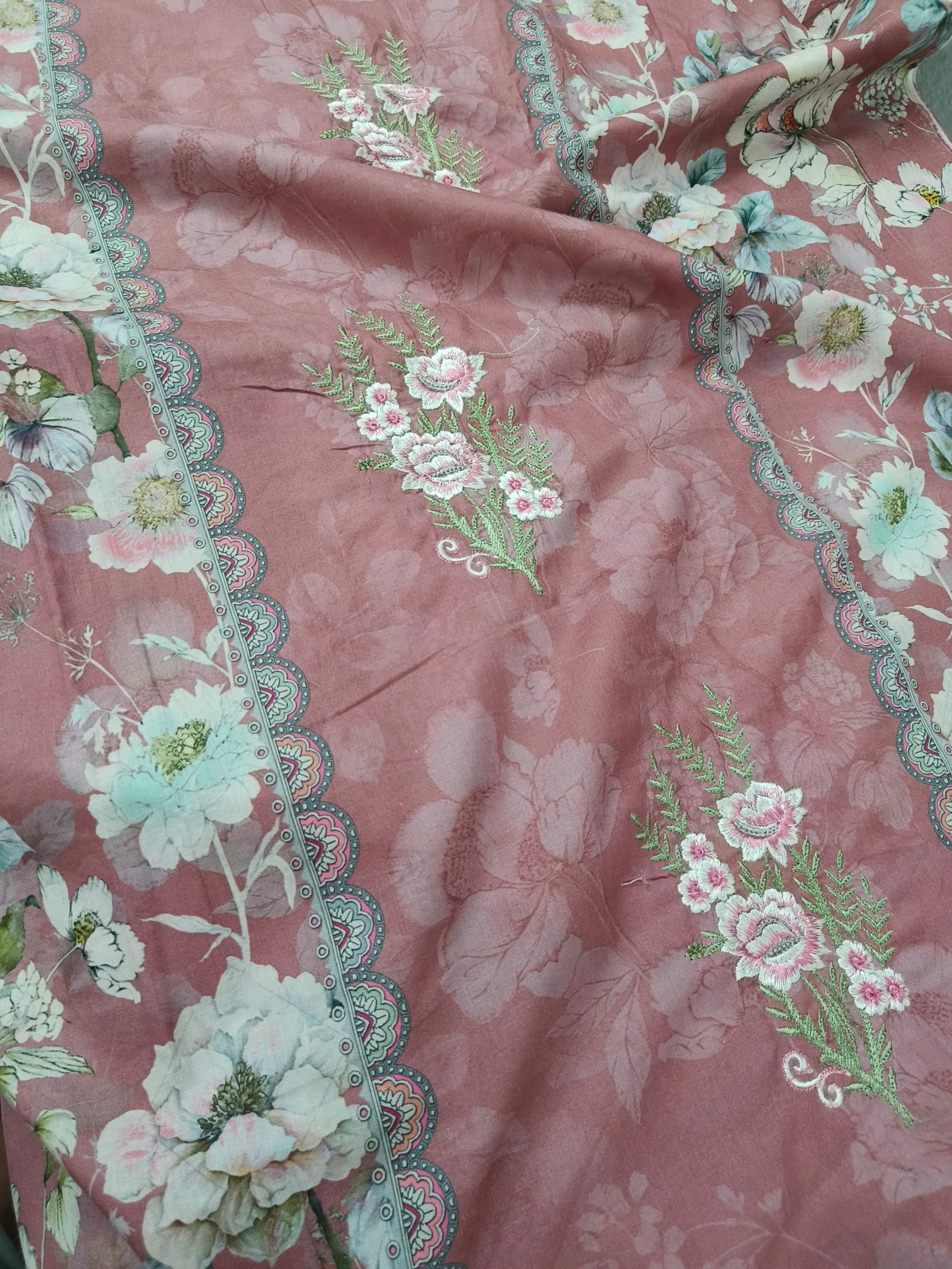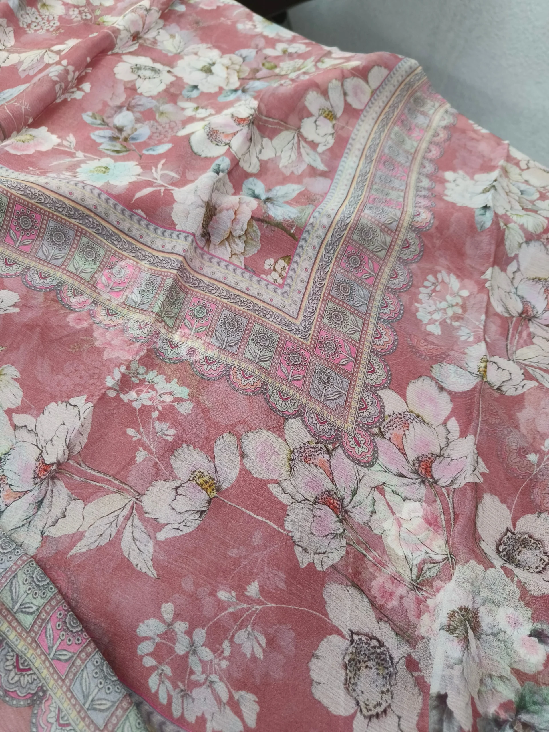 - Color: Mauve/Dusty Rose with floral accents (Top & Bottom), Multicolor borders, Chiffon Dupatta in coordinated tones