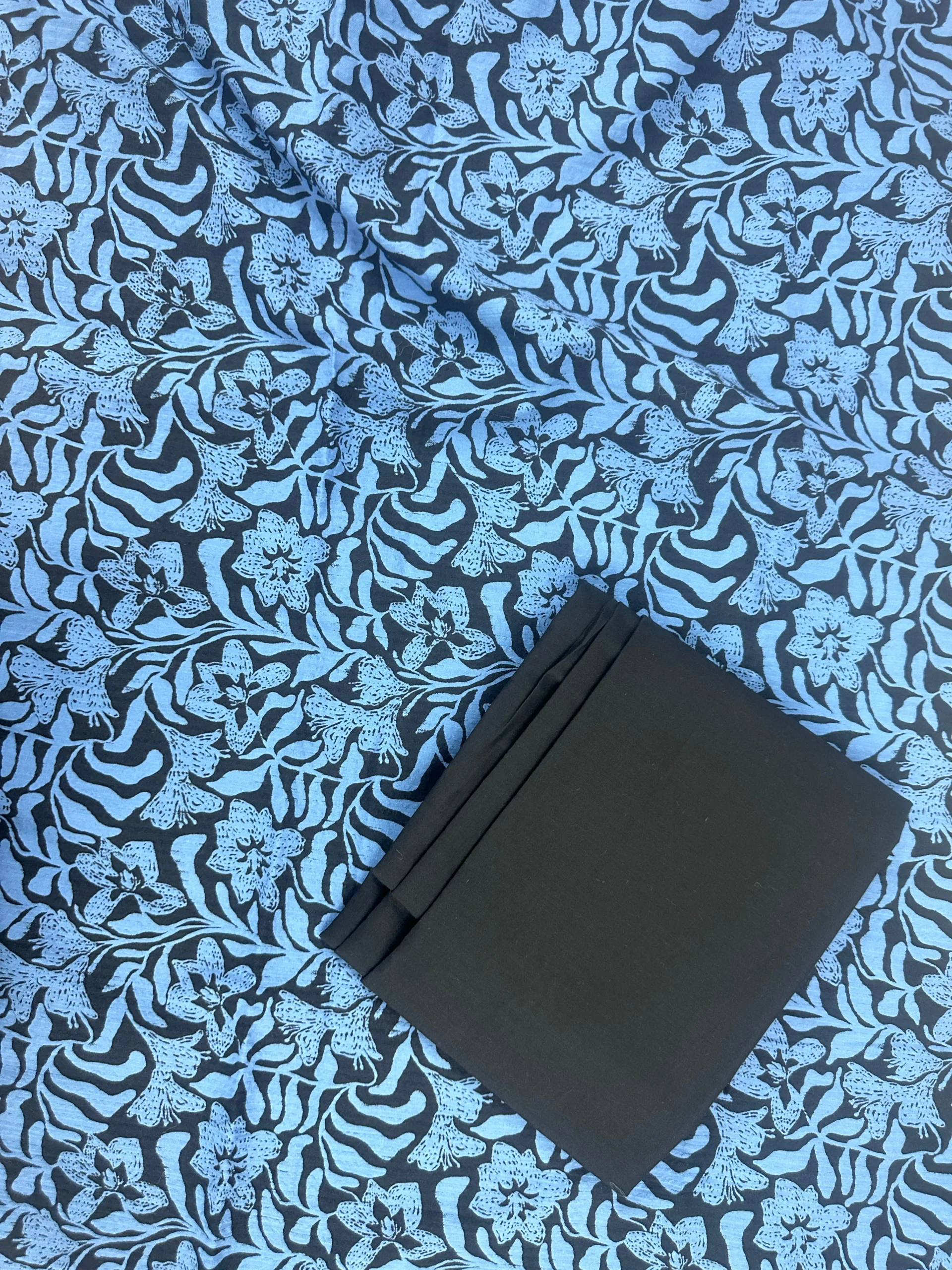 Elevate your ethnic wardrobe with this premium cotton unstitched suit set, featuring a striking black solid top fabric paired with a vibrant blue floral patterned dupatta and bottom. Designed for comfort and elegance, this ensemble blends traditional artistry with modern appeal, making it perfect for both casual gatherings and festive occasions.