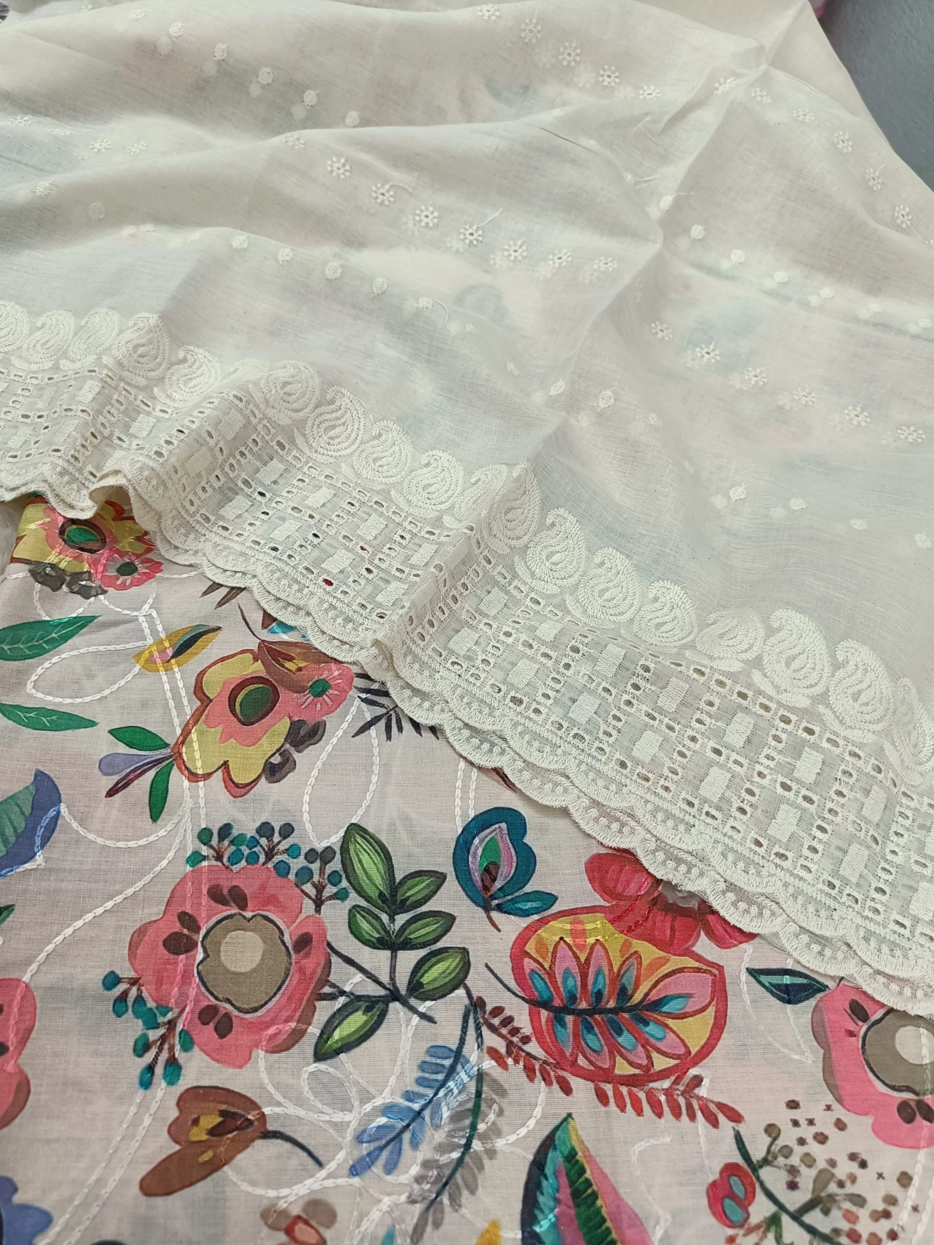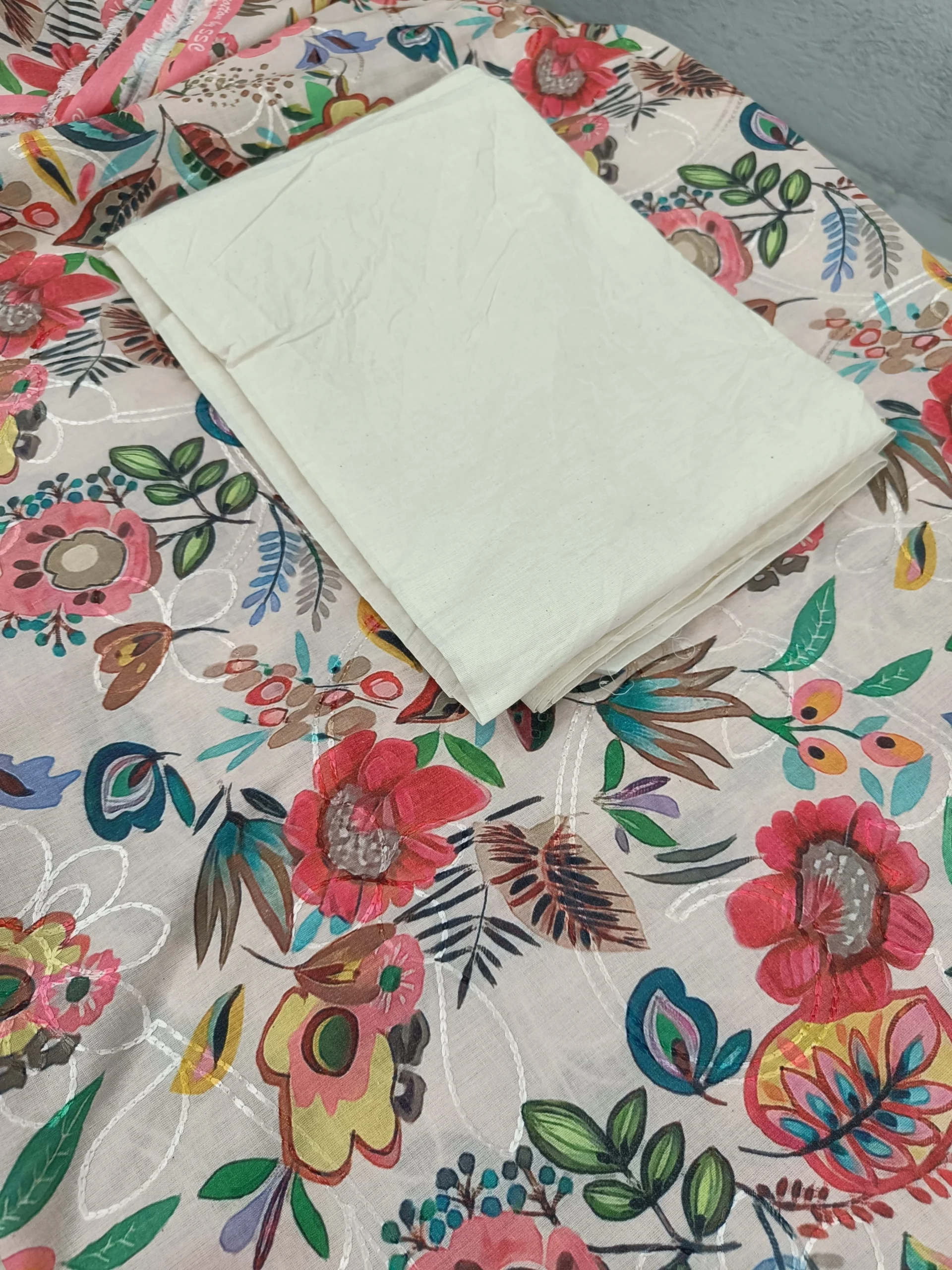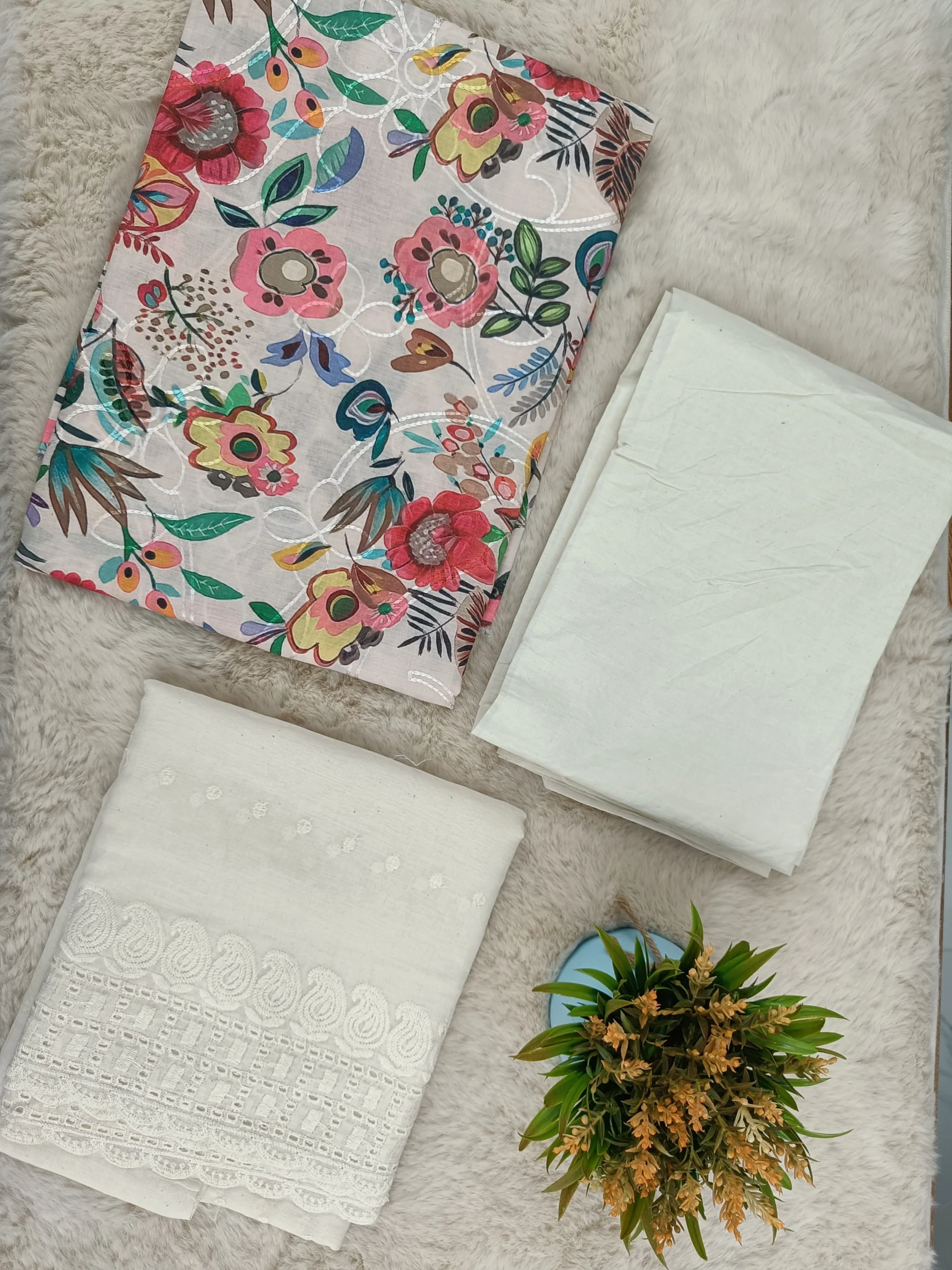 Elevate your ethnic wardrobe with this premium cotton unstitched suit set featuring a vibrant floral printed top, a plain cotton bottom, and a delicate chikankari dupatta. Designed for comfort and elegance, this ensemble blends traditional artistry with modern sophistication. Perfect for festive occasions, casual gatherings, or cultural celebrations, it offers versatility and timeless appeal.