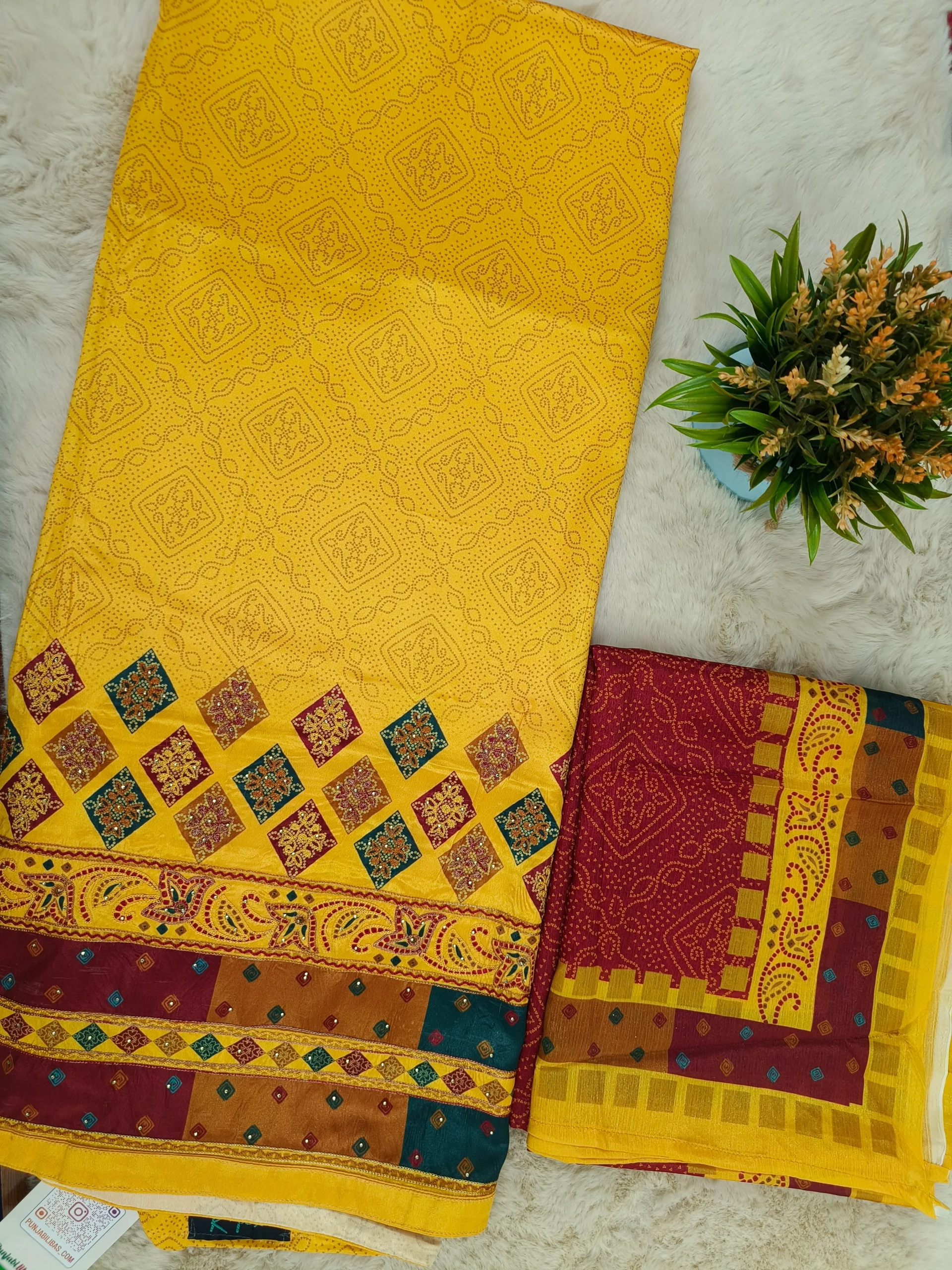 Discover timeless elegance with this Crepe Fabric Unstitched Suit featuring Ari Work Embroidery. The vibrant mustard yellow and maroon hues are beautifully enhanced with geometric diamond motifs and floral detailing, paired with a flowing semi‑chinon dupatta. Crafted for women who value traditional artistry and modern tailoring flexibility, this ensemble offers premium comfort, intricate craftsmanship, and generous fabric lengths for custom stitching. Perfect for festive occasions, cultural gatherings, and boutique styling, this suit embodies the rich heritage of Punjabi fashion.
