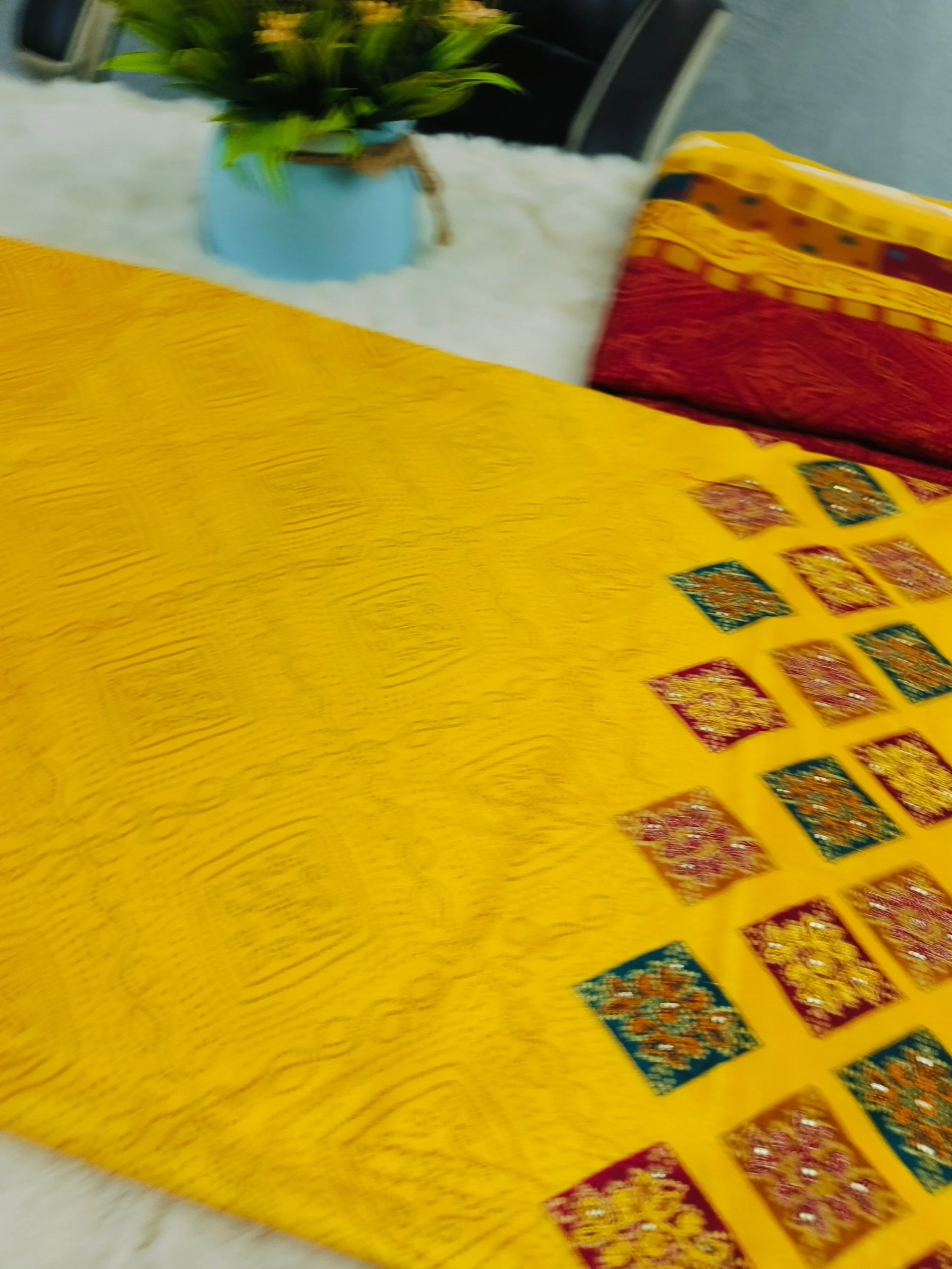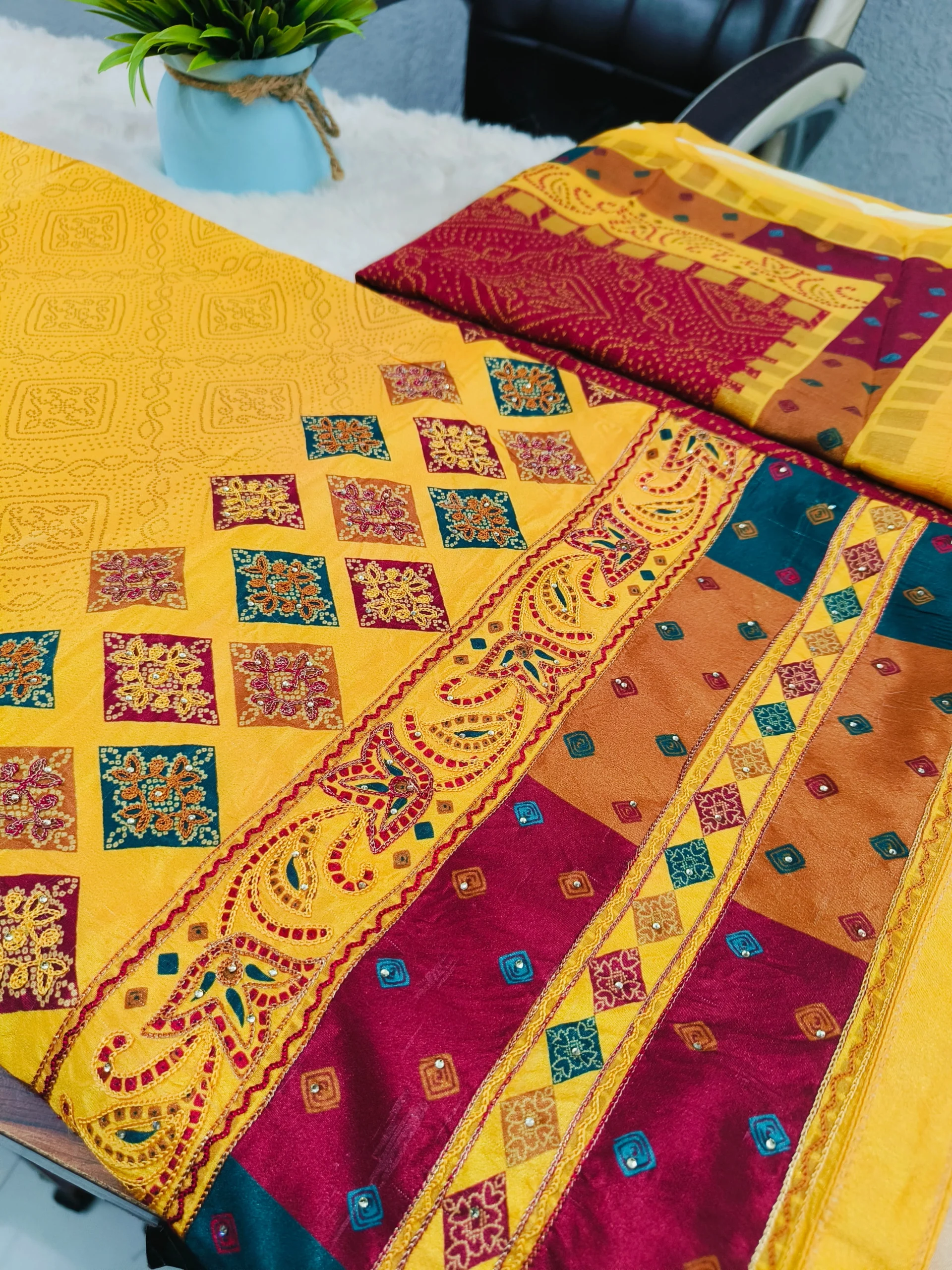 - Bottom Pattern: Solid maroon with complementary borders