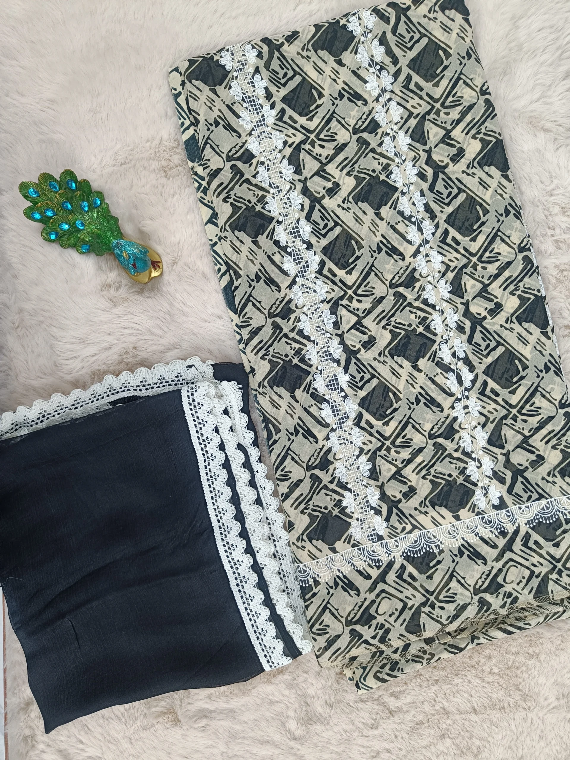 Elevate your ethnic wardrobe with this Georgette Unstitched Suit in Black & Beige, beautifully adorned with panel embroidery and delicate lace detailing. Crafted for elegance and comfort, this suit set includes premium georgette fabric for both top and bottom, paired with a chiffon dupatta that adds a graceful flow. Perfect for festive occasions, weddings, or cultural celebrations, this ensemble blends traditional artistry with modern sophistication.