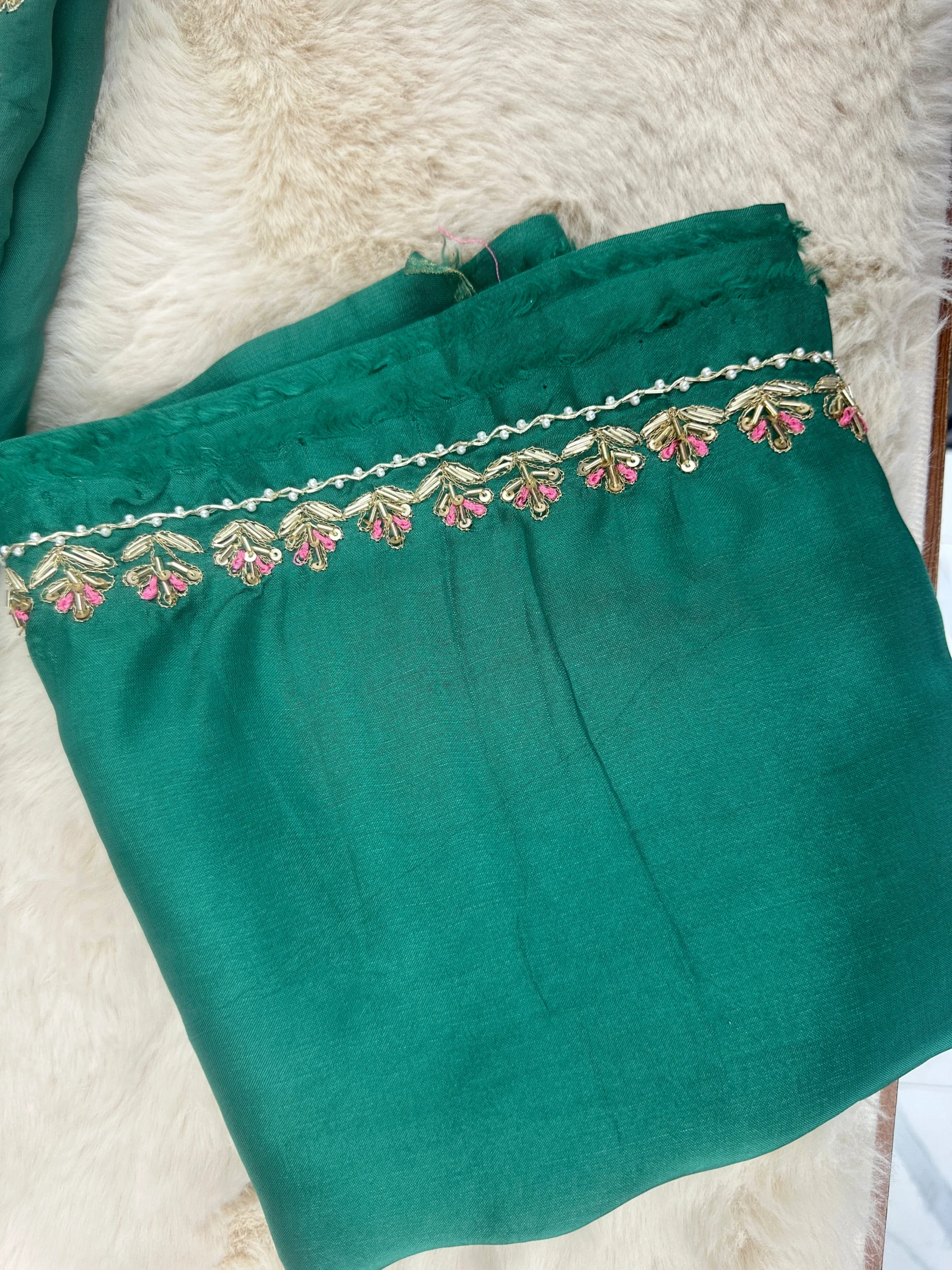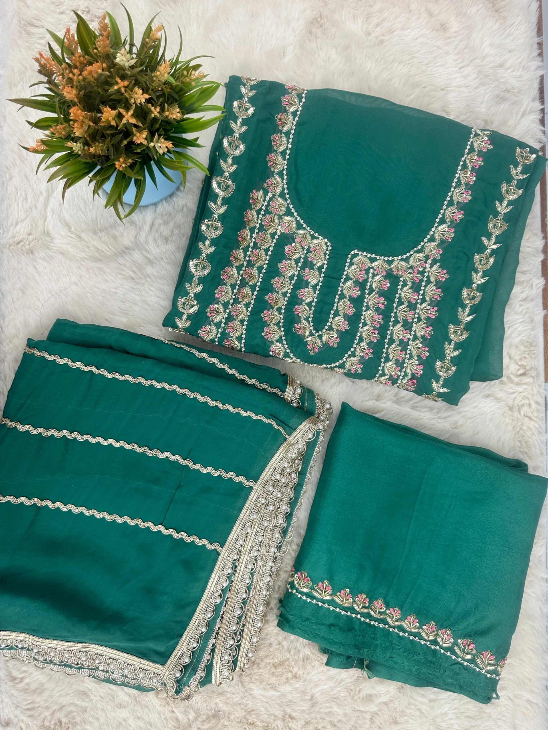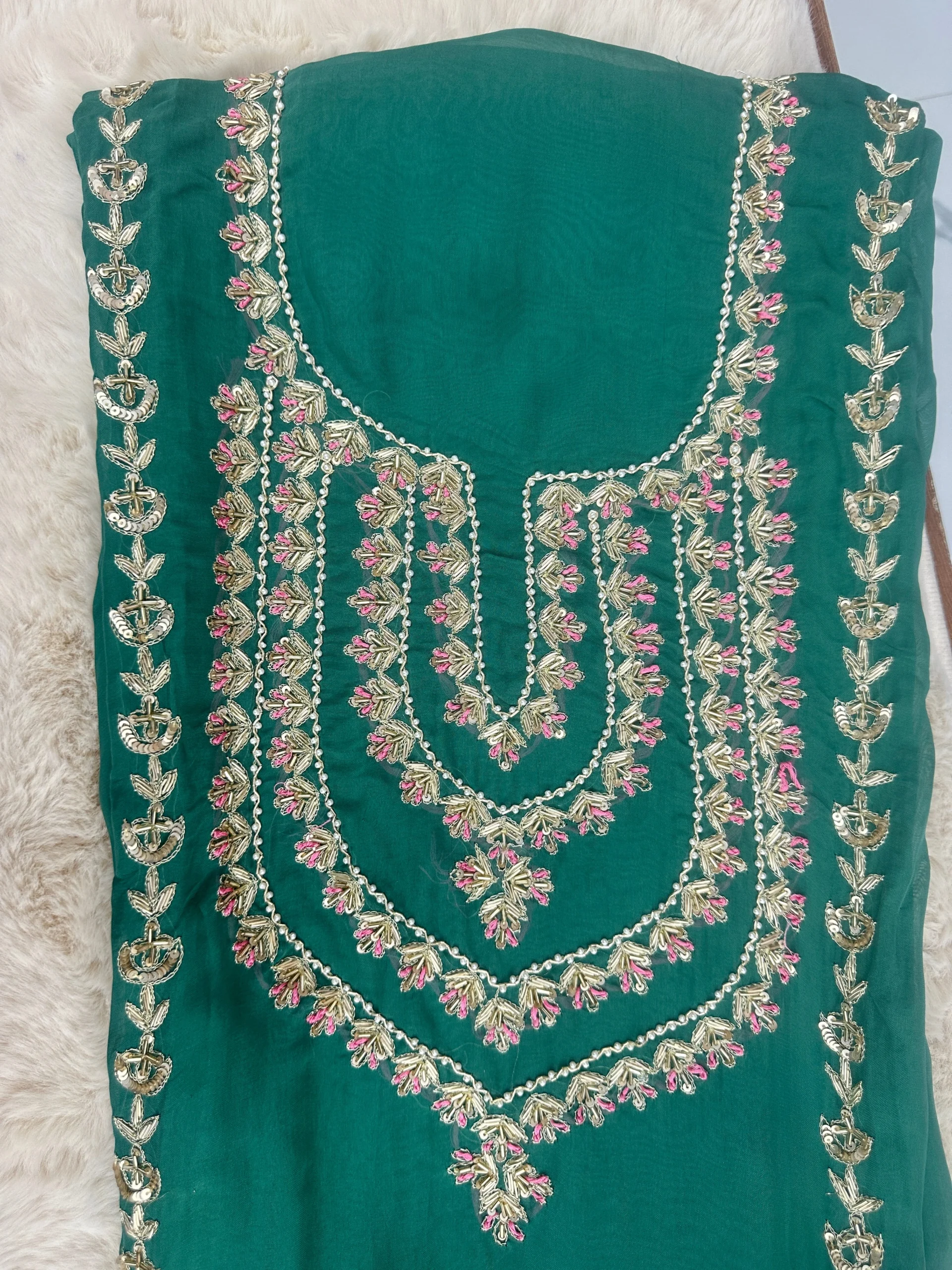 Elevate your ethnic wardrobe with this green embroidered organza unstitched suit material. Crafted with intricate floral and vine embroidery in silver, pink, and white threads, this ensemble blends traditional artistry with modern elegance. Perfect for festive occasions, weddings, or cultural celebrations, this suit set offers premium fabrics and versatile styling options.