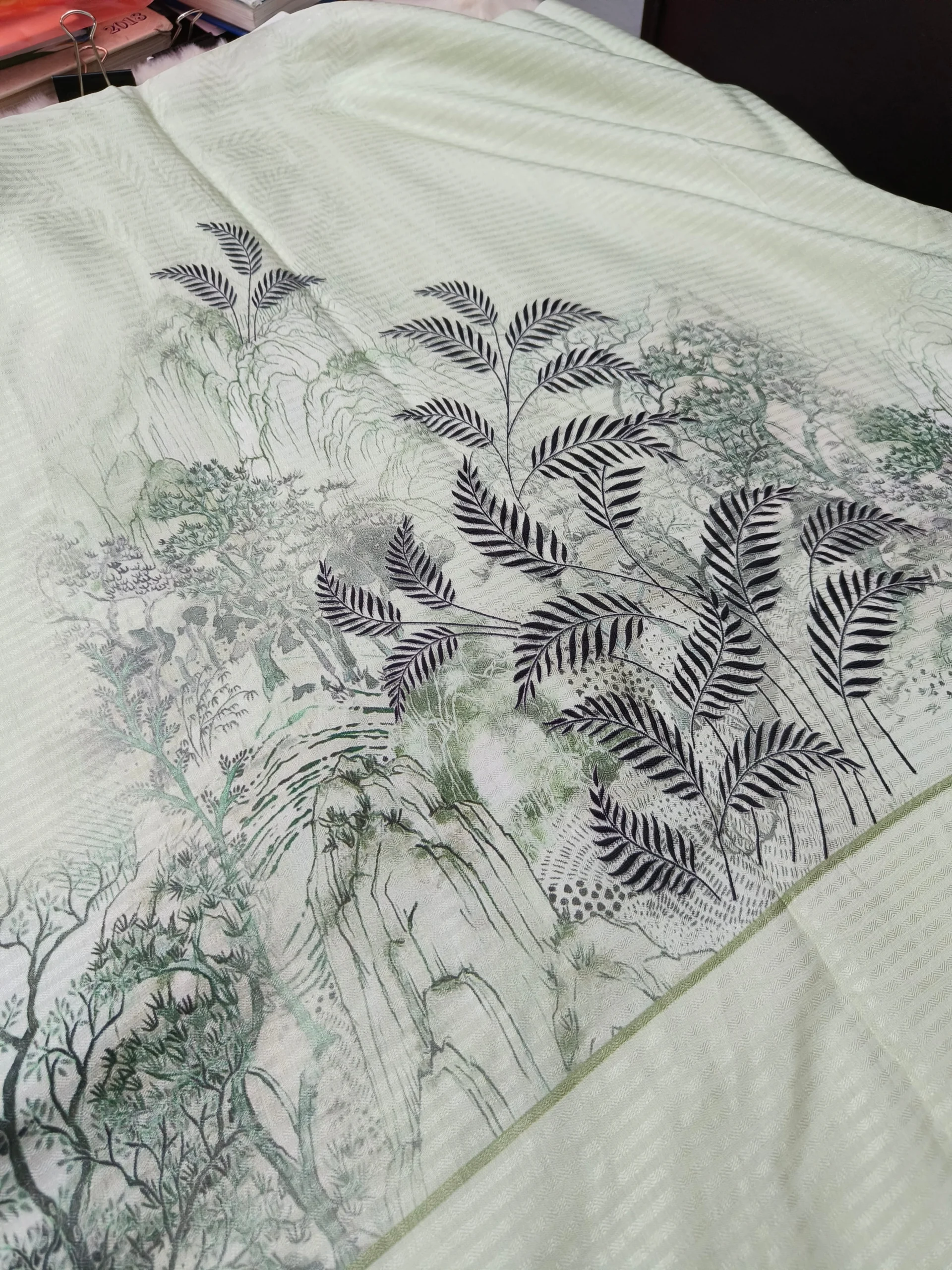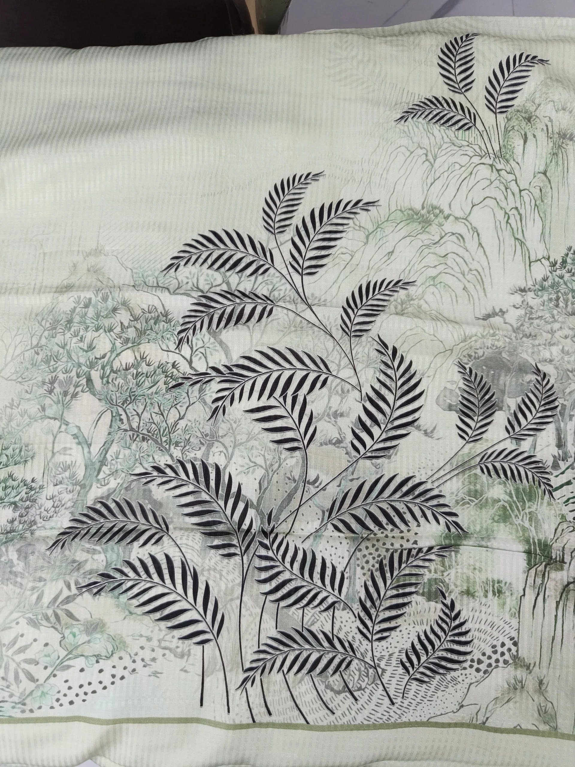 - Color: Light green base with foliage motifs in green & brown