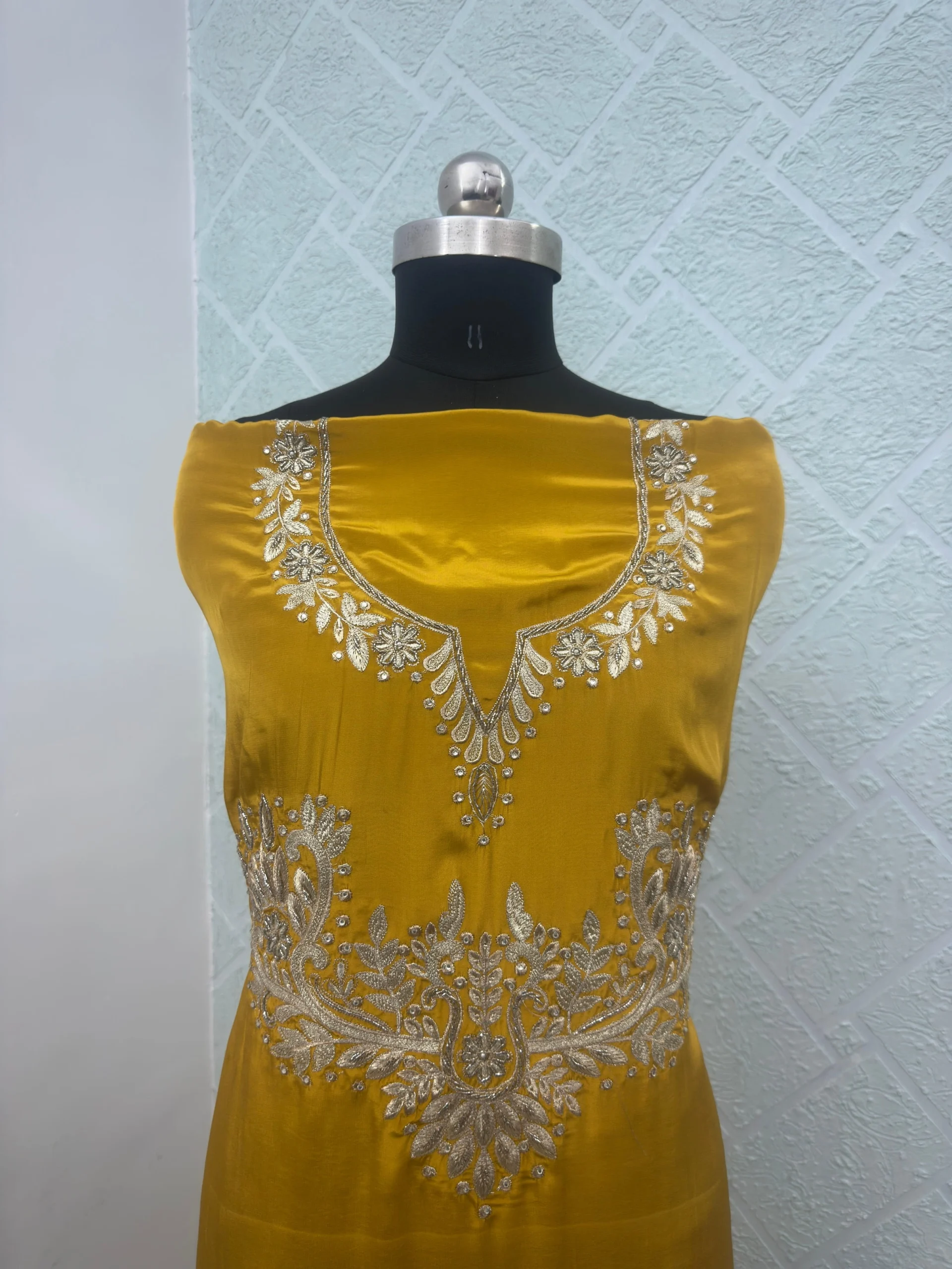 Elevate your ethnic wardrobe with this stunning mustard yellow unstitched suit crafted from premium Pure Crave fabric. Adorned with silver floral and paisley embroidery, this ensemble reflects timeless elegance and modern craftsmanship. The luxurious Pure Chinnon dupatta adds a graceful touch, making it ideal for festive occasions, weddings, or cultural celebrations.