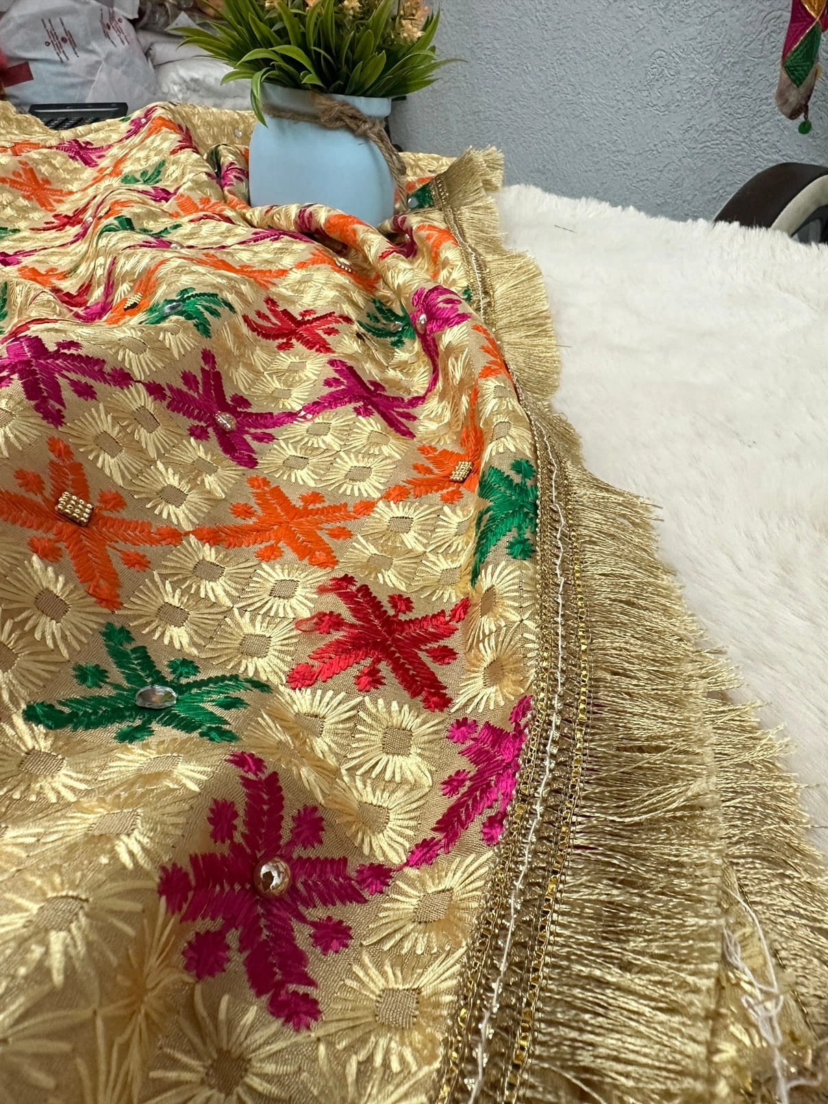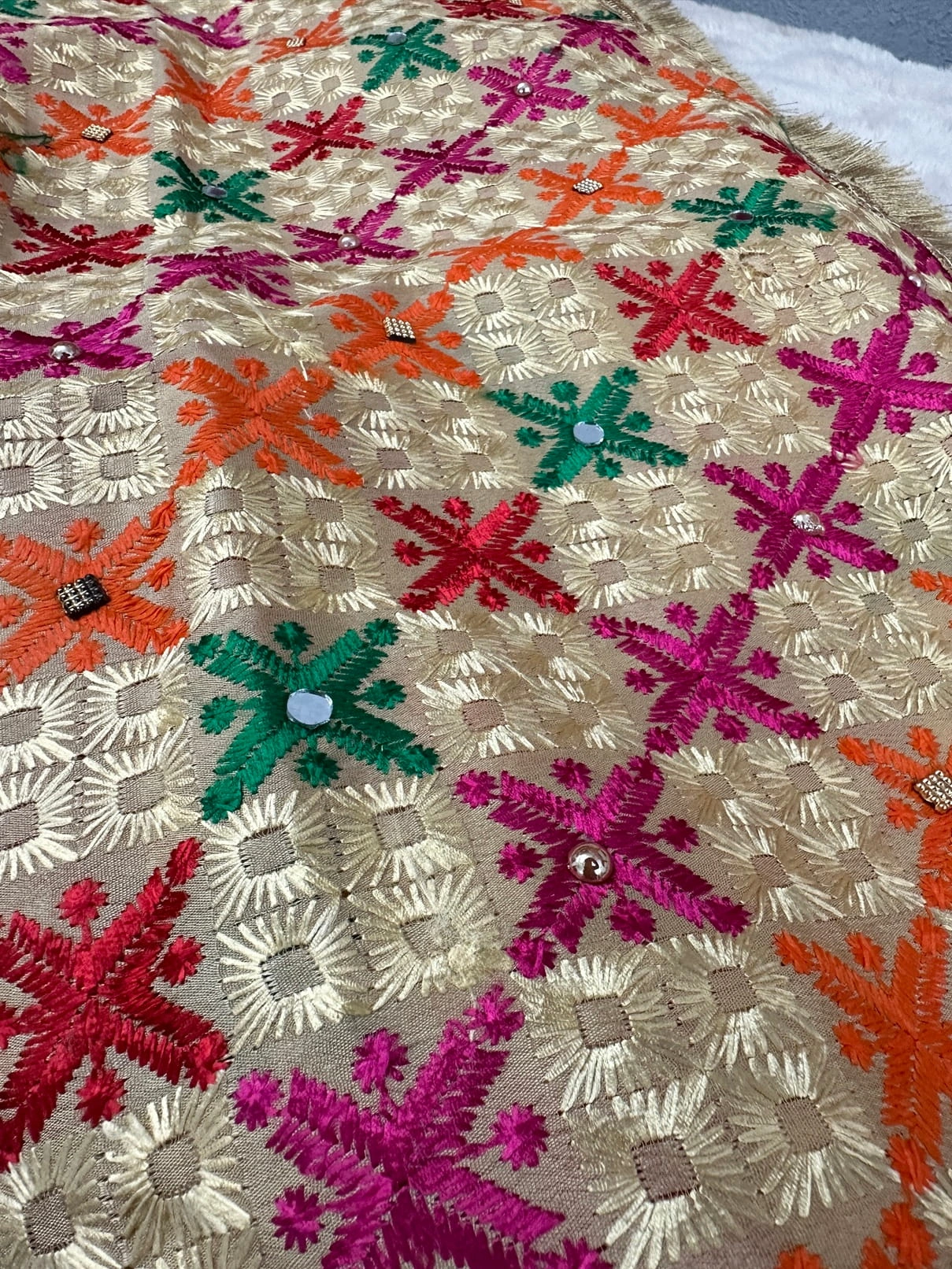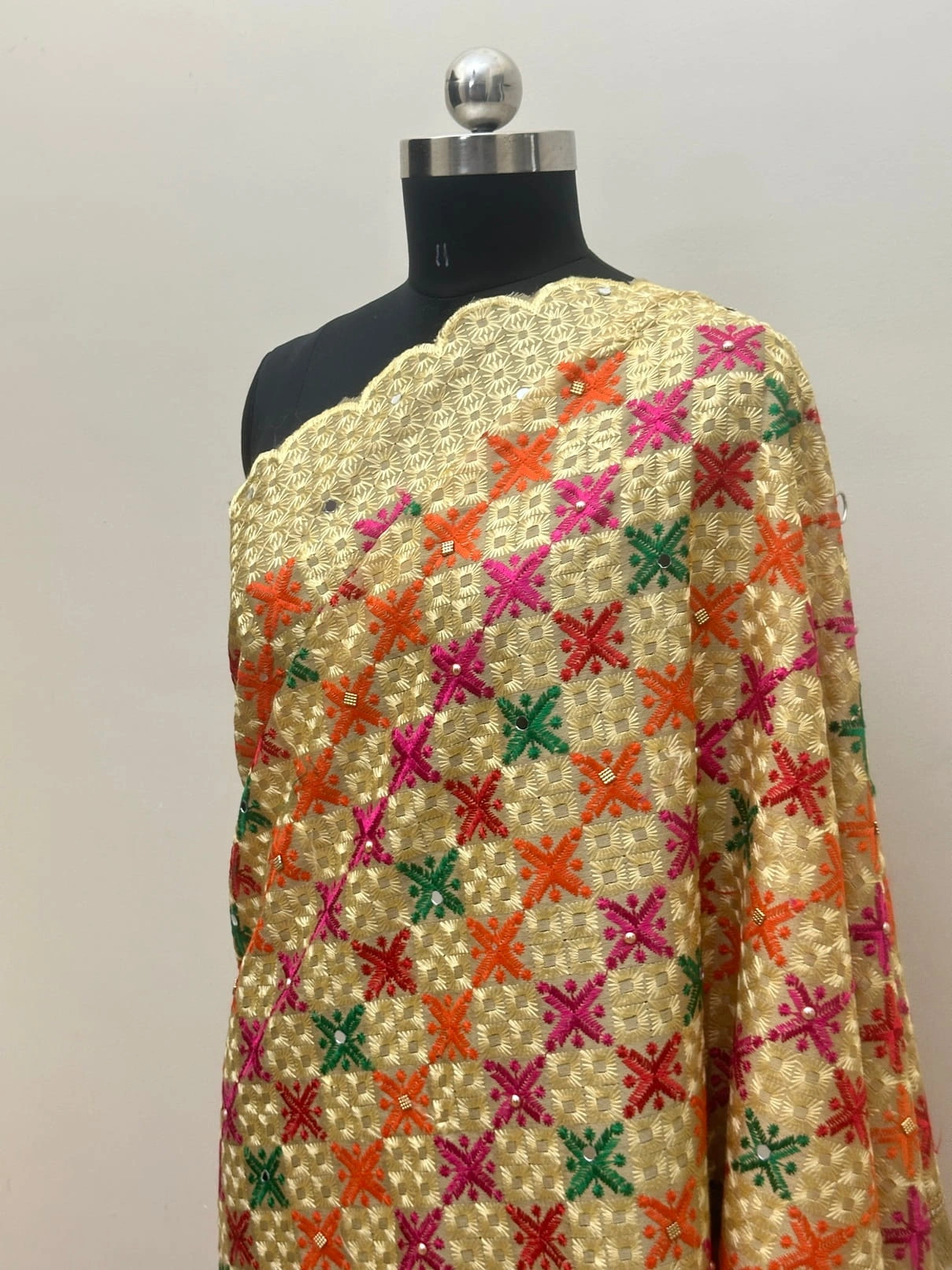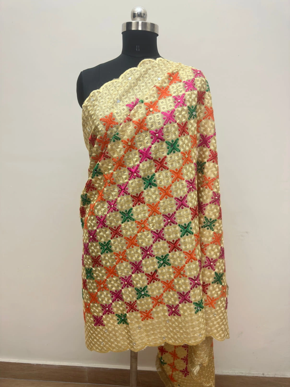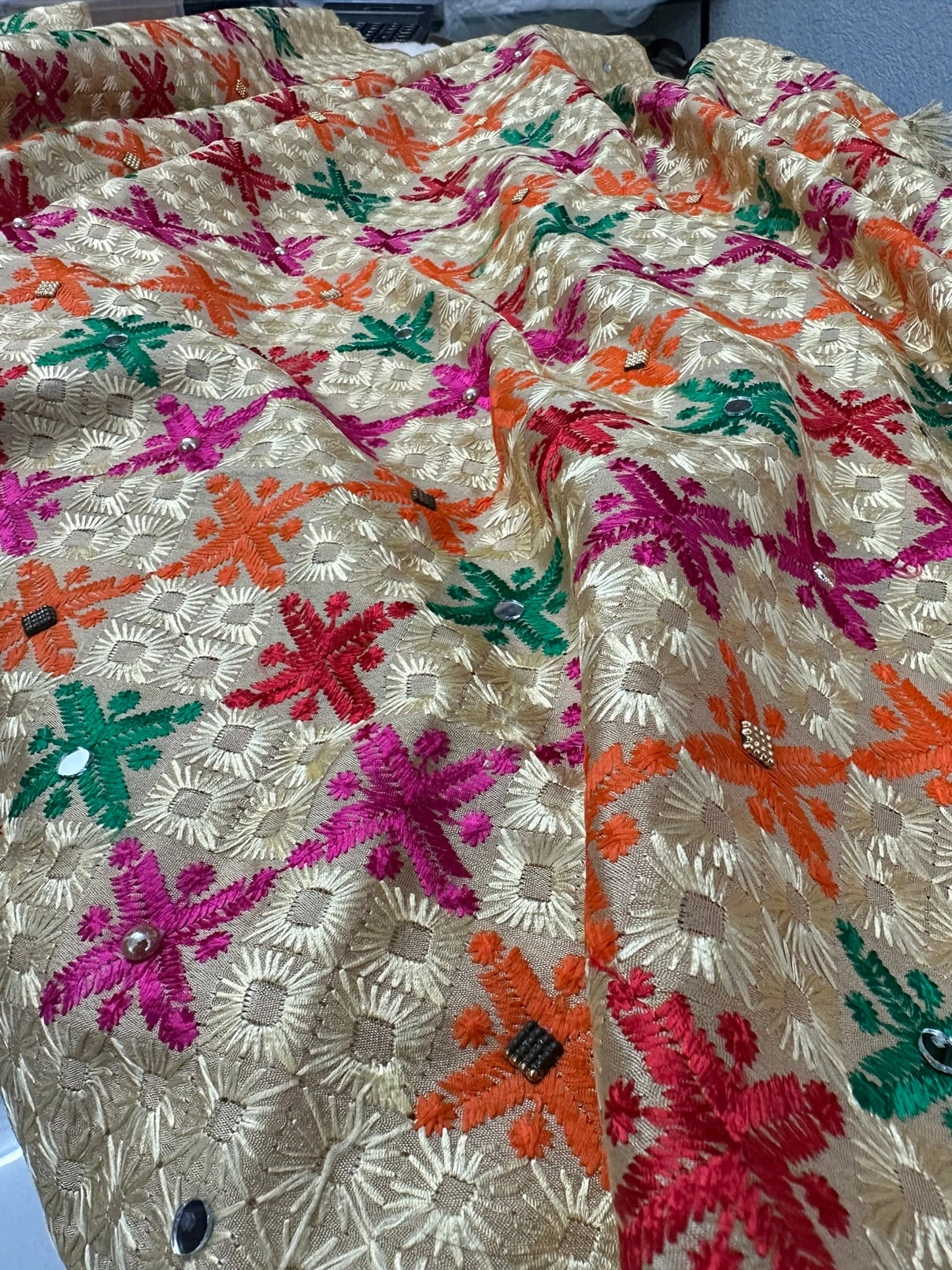Elevate your ethnic wardrobe with this Semi Chinnon Phulkari Dupatta, a masterpiece of Punjabi craftsmanship. Featuring vibrant floral motifs in pink, orange, green, and red on a golden base, this dupatta is adorned with mirror & stone work embroidery and finished with a cutwork border and golden gota patti lace. Perfectly blending tradition with elegance, it is designed to complement festive, wedding, and cultural occasions.