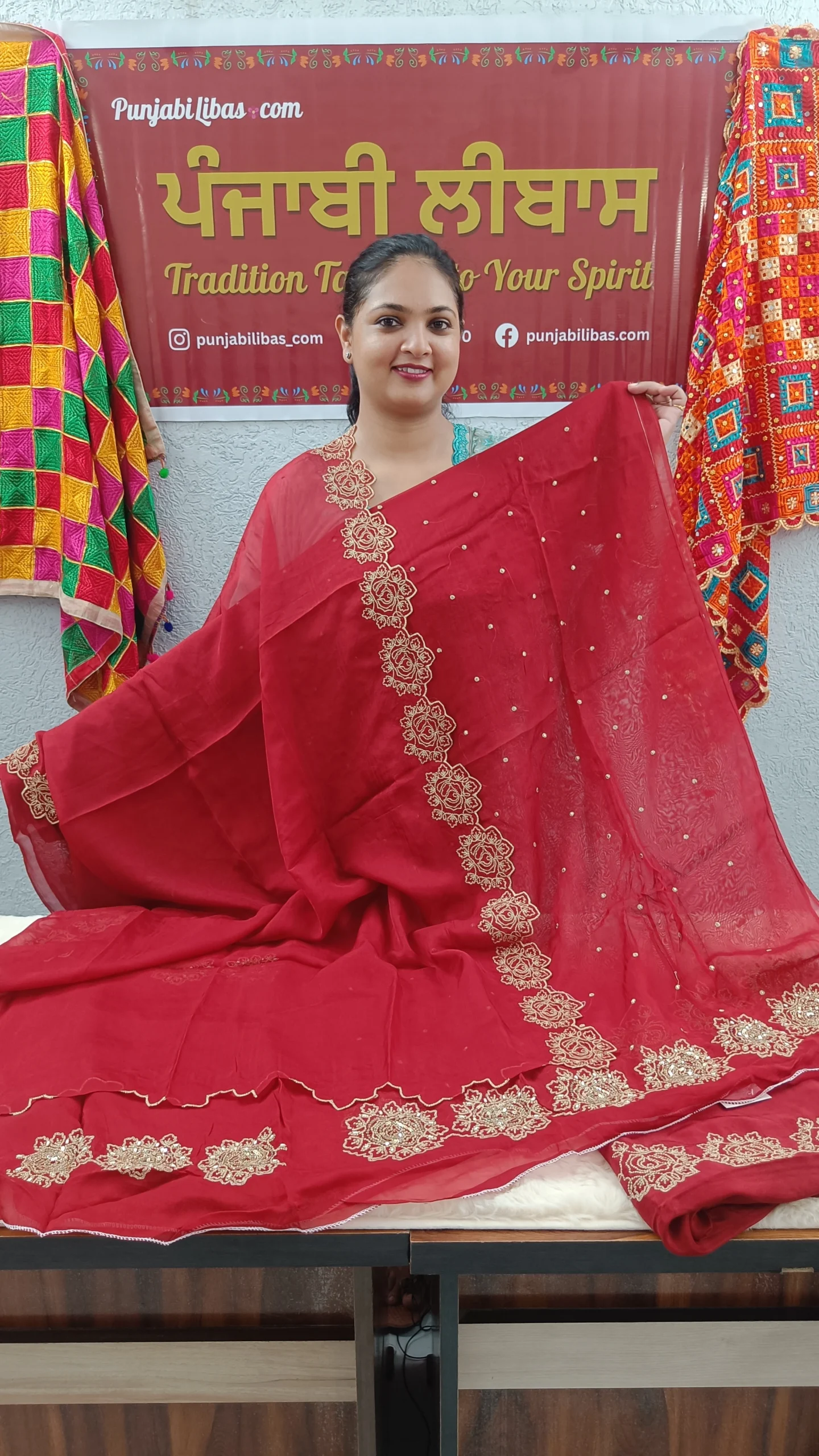 The dupatta is adorned with ornate borders and scattered golden accents, creating a regal silhouette that’s perfect for weddings, festivals, and cultural gatherings. Every detail—from the symmetrical motifs to the handcrafted embellishments—reflects the artistry of Punjabi heritage.
