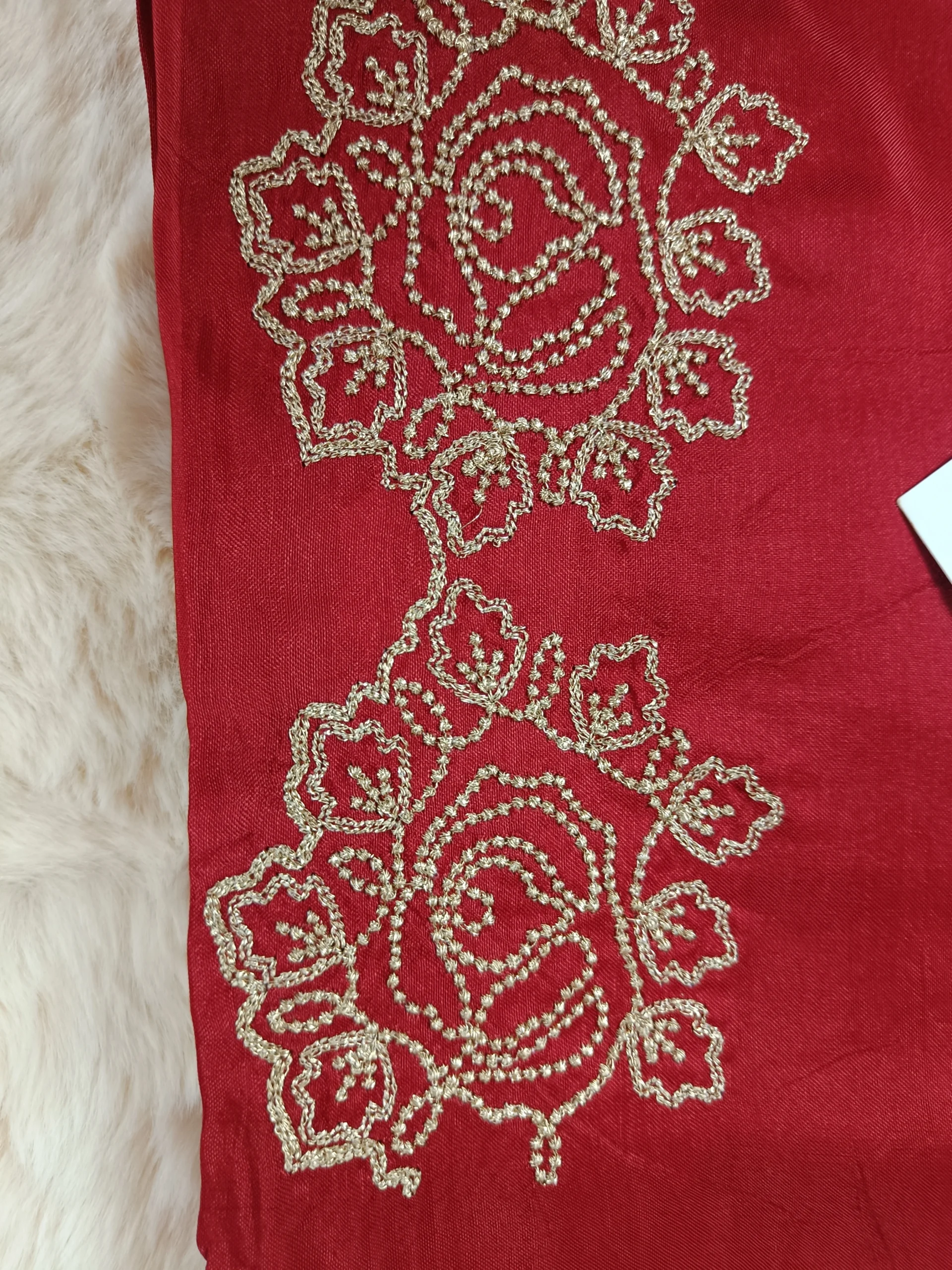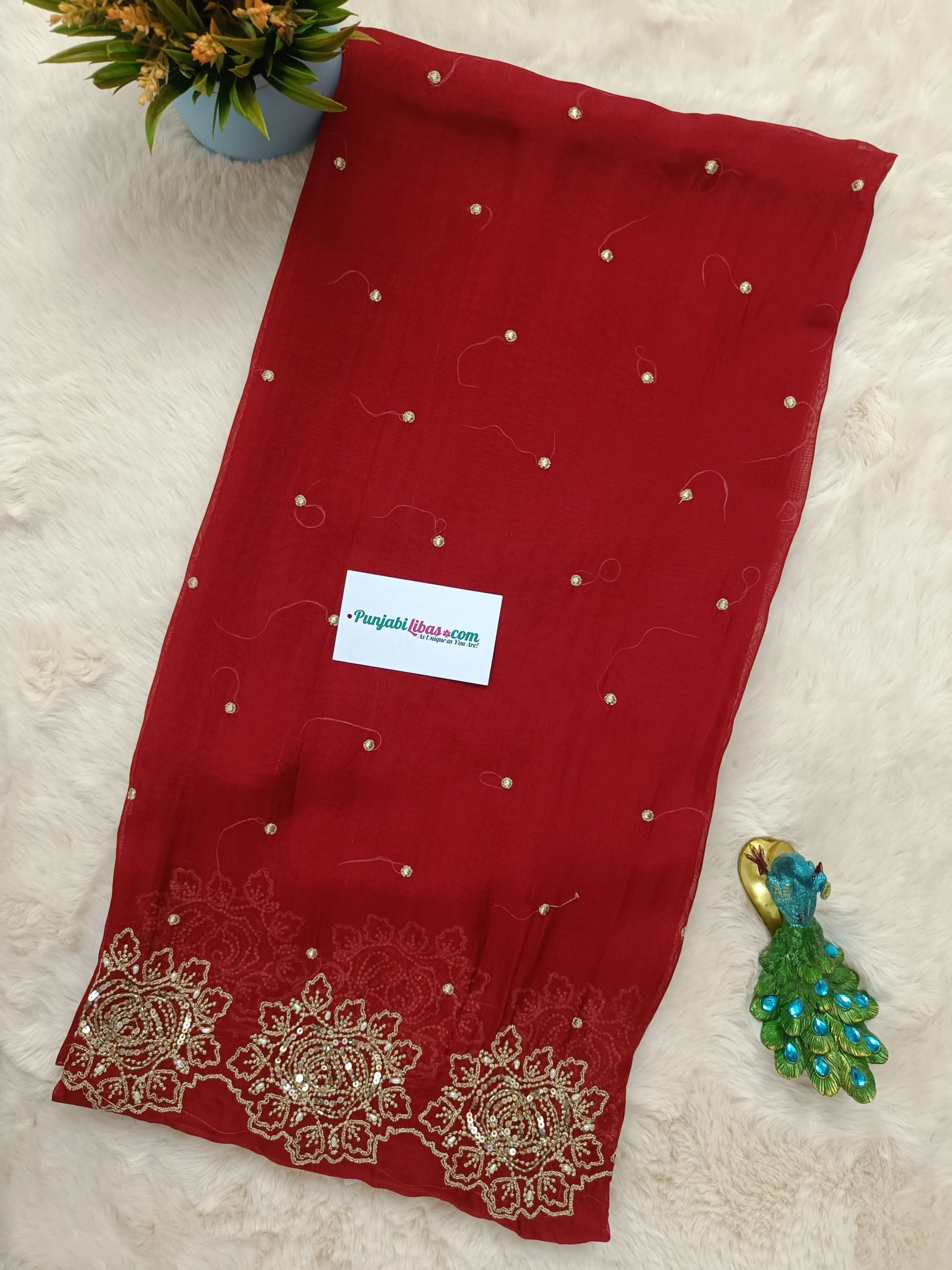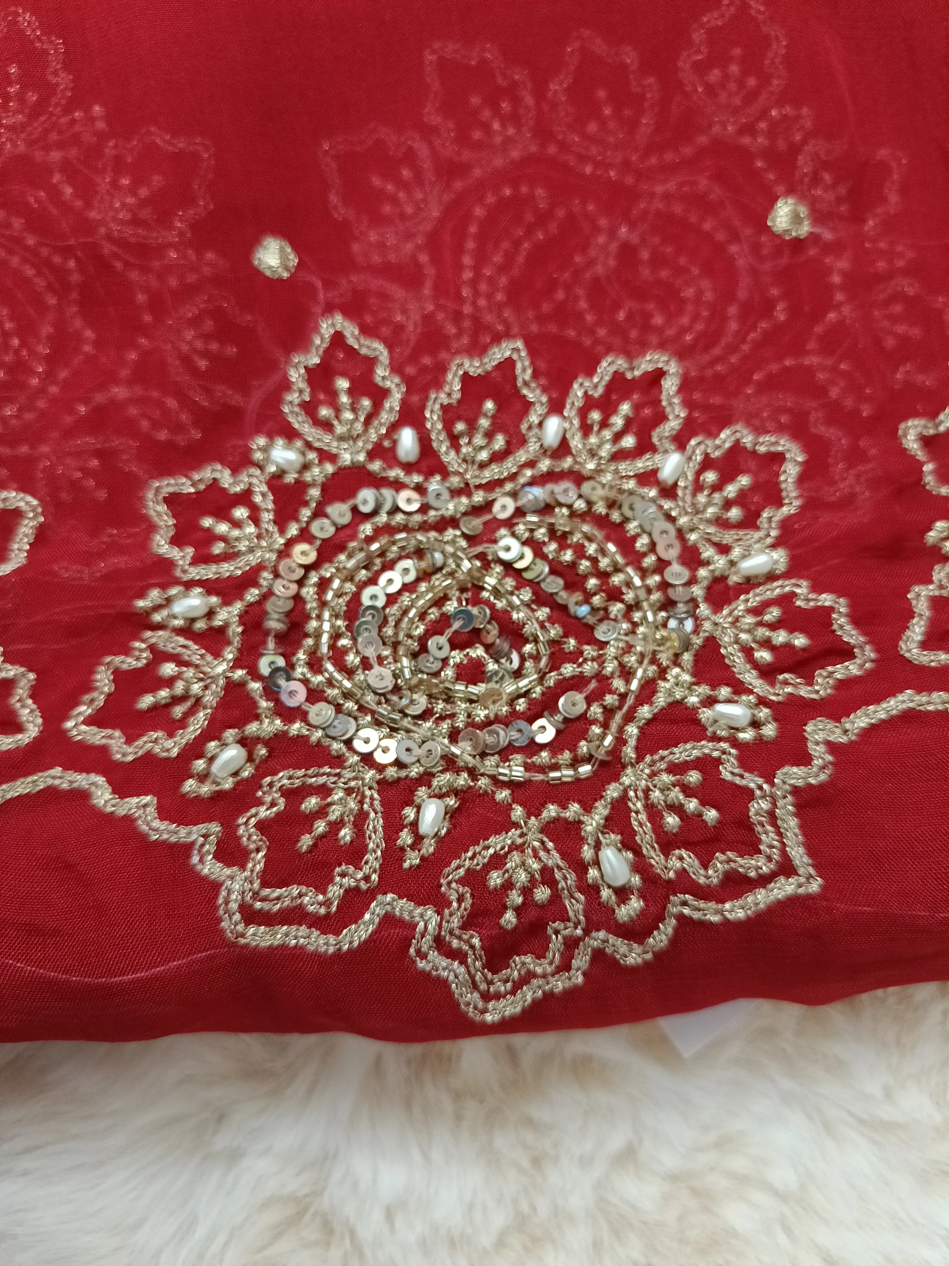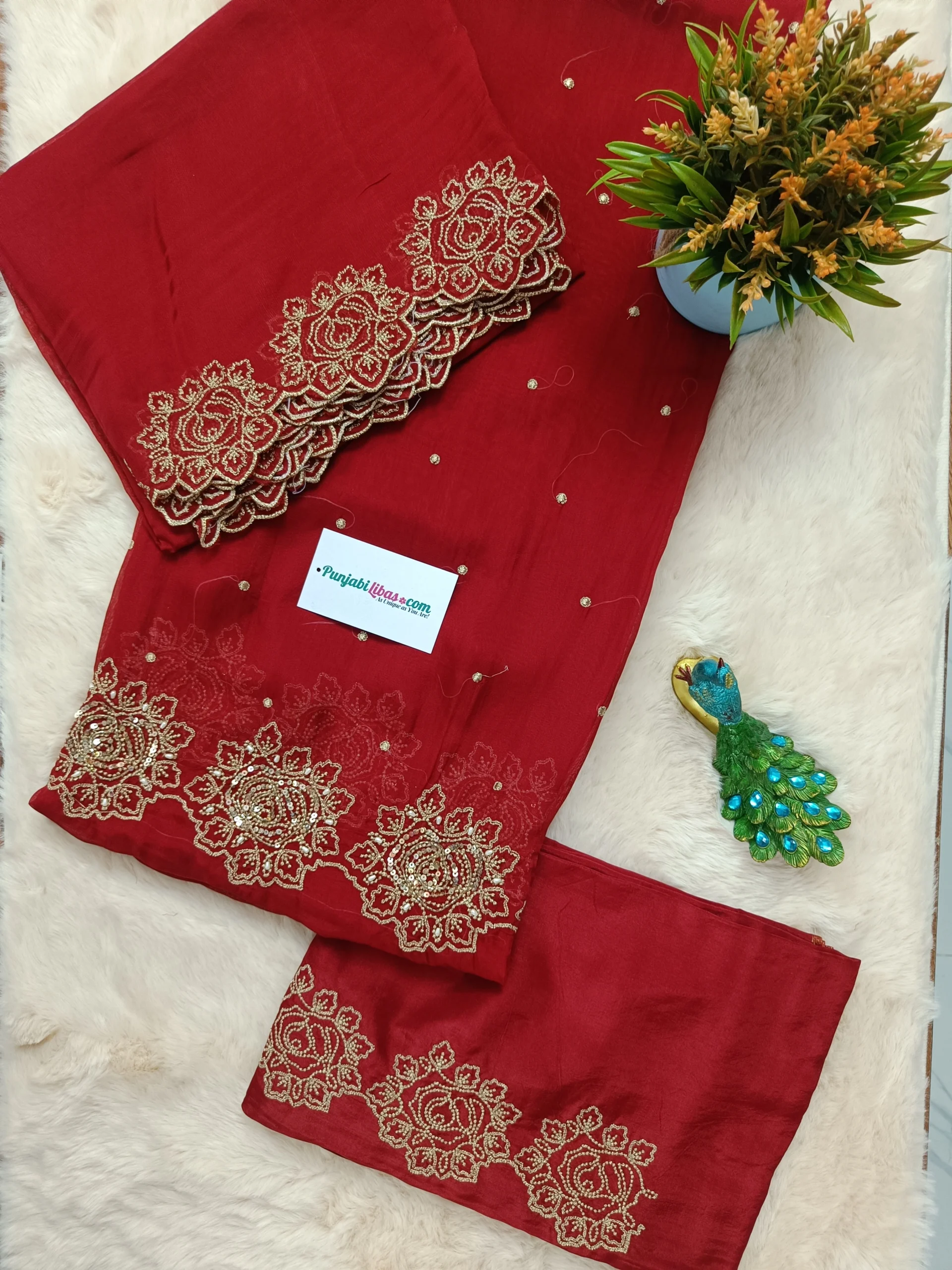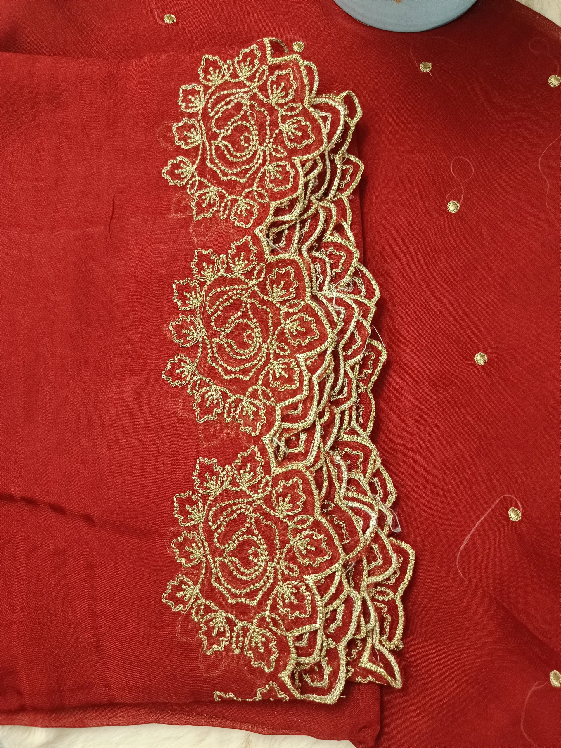 Introducing our Premium Red Unstitched Suit, a radiant celebration of tradition and elegance. This luxurious ensemble features deep red georgette fabric embellished with golden floral embroidery, shimmering sequins, and beadwork that exudes festive charm.