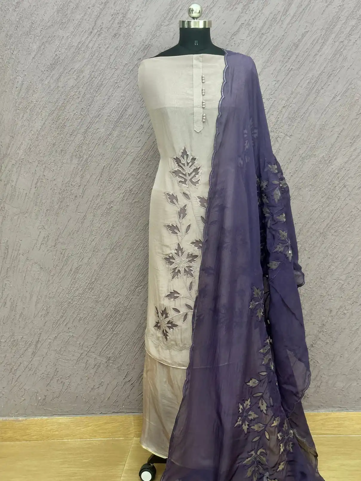 - Dupatta: Deep purple organza with scalloped edges & embroidery
